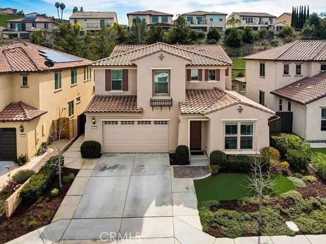 Located in the gated community of Victoria Grove, this Mediterranean-style home sits on a quiet cul-de-sac and offers scenic mountain views.