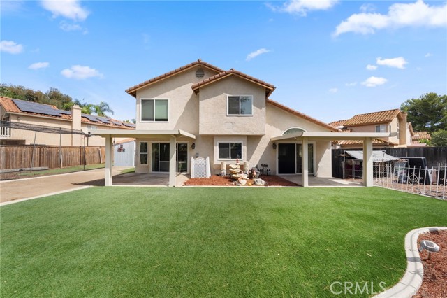 CHECK OUT THIS SPACIOUS TWO- STORY HOME IN THE HIGHLY DESIRABLE CENTRAL AREA OF MURRIETA (minutes from the 215 AND 15 freeways!) offering both comfort and long-term peace of mind. With a DOWNSTAIRS bedroom plus a Primary Suite w HUGE /Retreat, artificial grass front AND back, new windows and sliders, this home is a MASSIVE WIN!! The home has been carefully maintained and thoughtfully updated with SOLAR Panels PLUS, a complete REPLACEMENT OF THE UNDERGROUND PIPING/SEWAGE SYSTEM, (an upgrade that adds tremendous value) and reliability for years to come. You'll find the interior bright and open with a new LVP flooring downstairs and an updated kitchen-along with spacious living areas with multiple bedrooms (virtually staged to showcase modern layouts), vaulted ceilings, and plenty of natural light. The bathrooms are generously sized, with double vanities and a primary suite retreat featuring a soaking tub, separate shower, and serene views. Practical touches such as a full laundry room with cabinetry and additional upstairs storage ensure convenience at every turn. The outdoor space is designed for easy enjoyment with low-maintenance turf, dual covered patios, and unique gathering areas. A pergola with a pool table, open seating zones, and plenty of yard space make this backyard perfect for entertaining, sports, or simply relaxing at home. This property also backs up to community green space, with a neighborhood park just steps away that includes a playground, walking trails, and mature trees for shade. Conveniently close to schools, shopping(The Promenade Mall), and GREAT dining! NO HOA AND LOW TAXES!