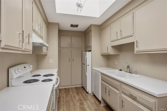 Short term/longer term Upper 1BR popular Coronado floorplan with no steps and no one above. Carport just steps away to front door. Modern upgrades such as new incredible kitchen skylight, low maintenance vinyl planking flooring both rooms, dual pane windows and slider, smooth ceilings and designer paint colors. The sun filled kitchen is thoughtfully designed with raised counters for both style and practicality. Bathroom with convenient walkin shower and new vanity. HVAC high efficiency offers year round heating and cooling comfort. AC/Heat in bedroom too. Key takeaways are no one living above you, a very large balcony offering greenbelt views with a great breeze and natural air and light flow. This home also provides the convenience of no-step access to the carport, and laundry facilities, ensuring easy mobility. Added bonus to this location is that it is within walking distance to the very popular Clubhouse 4 ARTS Center and pool. Located within a vibrant 55+ community, this remodeled residence combines comfort and modern living. This is an amazing home in one of Laguna Wood's premium areas! Laguna Woods Village residents enjoy a 27-hole championship Golf course, a 9-hole executive par 3 course, Pickleball and Tennis courts, Gyms, Clubhouses with 200 clubs such as the Comedy Club and Performance Arts Theater. Horse stables and Saddleback Emeritus College Art programs with world class Art facilities is same Gate 5. Take advantage of this opportunity to enjoy a serene lifestyle with all the amenities and services that Laguna Woods has to offer.