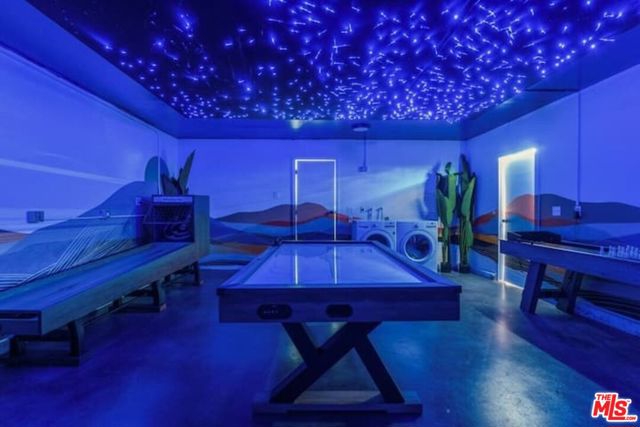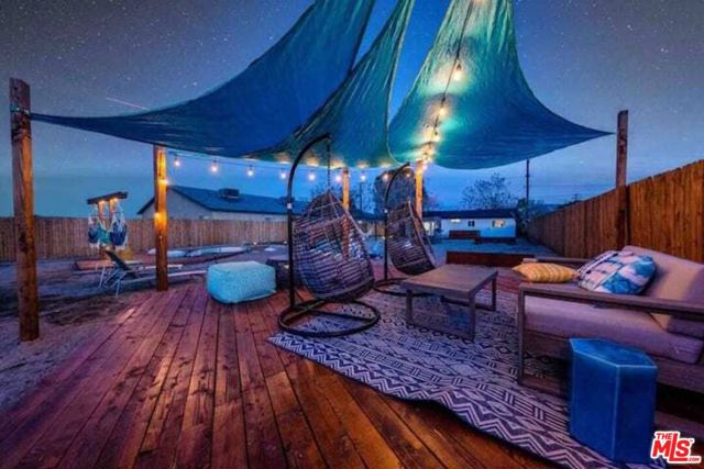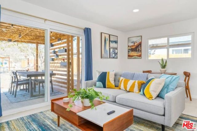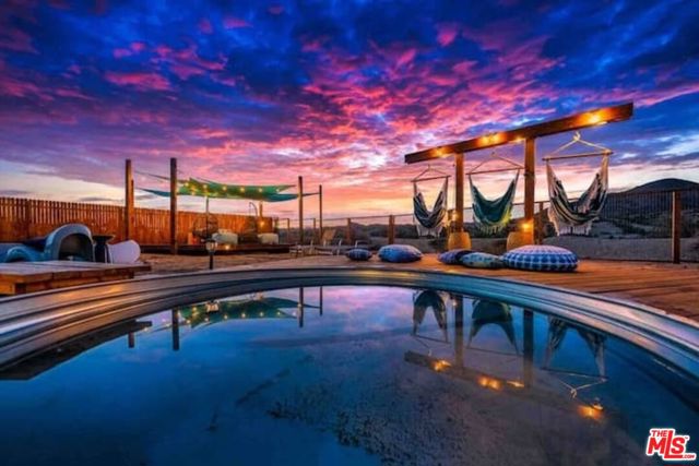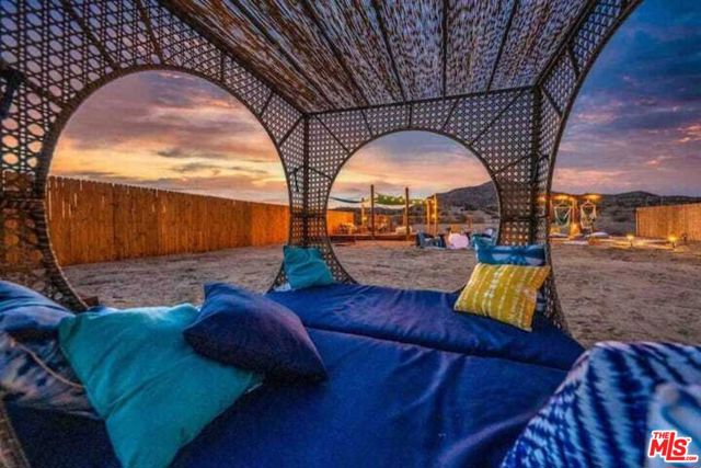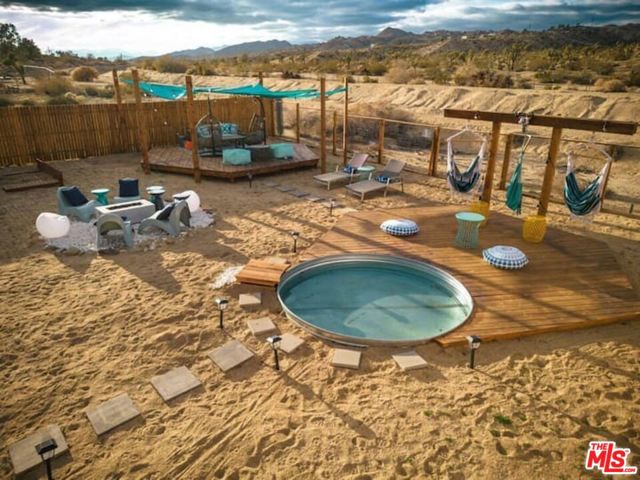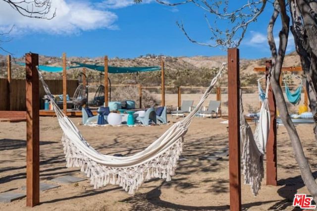 Welcome to Dusty Dunes, a thoughtfully designed desert sanctuary that perfectly blends modern comfort, high-end style, and the serene natural beauty of Yucca Valley. Tucked away on a fully fenced lot with sweeping mountain views, this beautifully upgraded home features three spacious bedrooms, two bathrooms, and an exceptional garage-converted game room with skee-ball, air hockey, shuffleboard, and a striking star-lit skylight that creates a truly immersive entertainment experience. Inside, the home offers a bright open layout with curated design elements, central heating and cooling, high-speed internet, and a 55" 4K smart TV, while the chef-inspired kitchen boasts premium Cafe appliances and all the essentials for elevated living. Outdoors, the property transforms into a private resort-like retreat with multiple lounging areas, hammocks, swings, a shaded dining patio, horseshoes, a fire pit for stargazing, an outdoor daybed, and a relaxing hot tub perfectly positioned to take in the mountain vistas. With easy paved-road access, ample parking, and a convenient location just minutes from town and a short drive to Joshua Tree National Park, the home strikes the ideal balance between seclusion and accessibility. As a proven high-performing short-term rental grossing over $65,000 annually, this home offers exceptional potential as a full-time residence, vacation getaway, or income-producing investment property - delivering a complete lifestyle experience that captures the magic of the high desert.