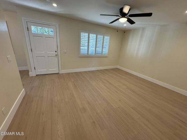 Welcome to this updated, single story home in the desirable Rancho Sequoia neighborhood. Freshly painted throughout with smooth ceilings, updated dual pane windows, and gleaming wood laminate floors, this home offers comfort and style. The inviting living room flows seamlessly into the cook's kitchen featuring quartz countertops, updated cabinetry, a large stainless steel sink, and attractive tile flooring--perfect for everyday living. Both bedrooms are ample sized, with one offering direct access to the backyard through a sliding glass door. Additional highlights include central air and heat, an indoor laundry area, and a convenient direct access garage. Tucked away on a quiet interior lane just off the main street, this home offers easy access and ample parking. Located just minutes from local parks, shopping, and schools, it's the perfect blend of privacy and convenience.