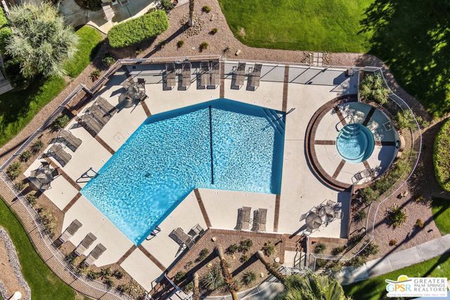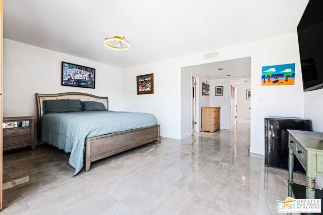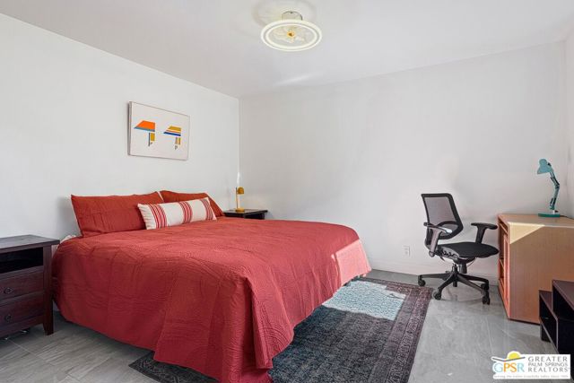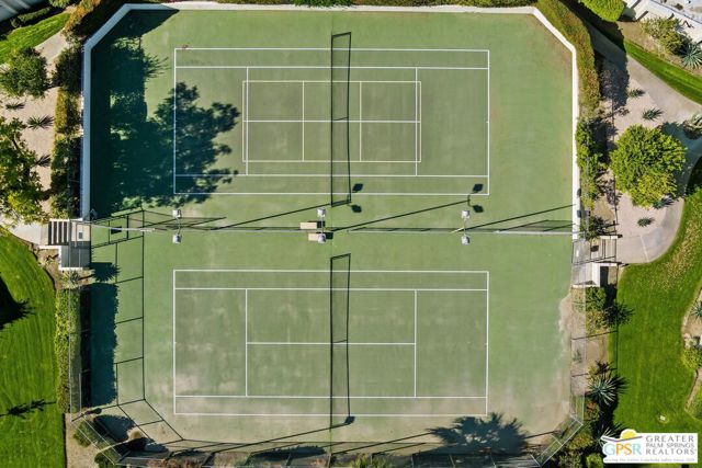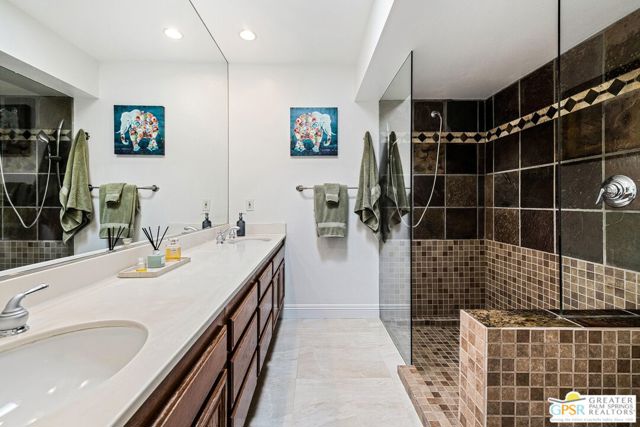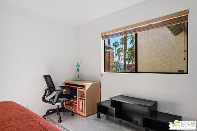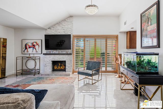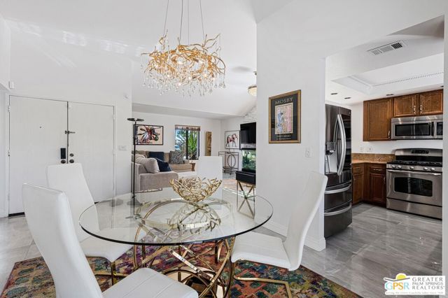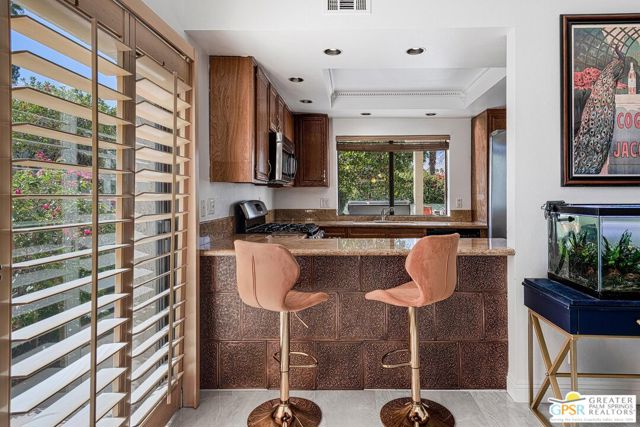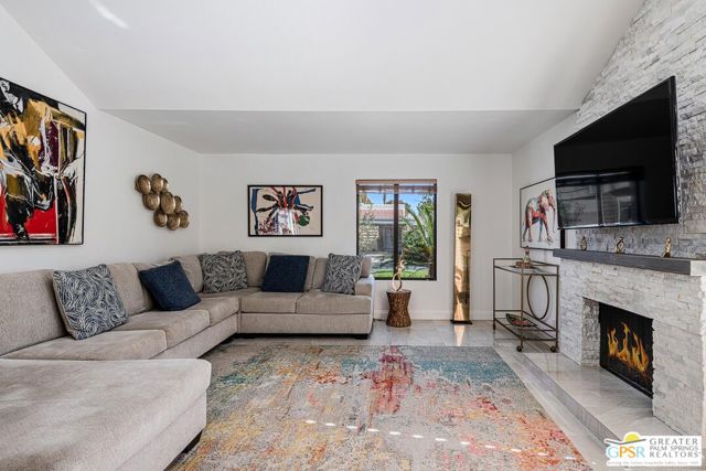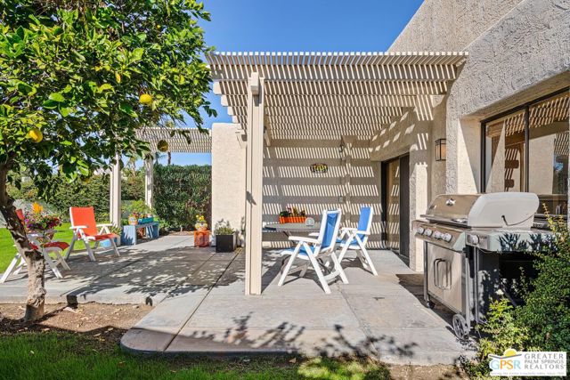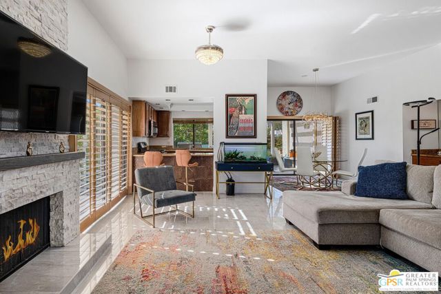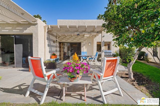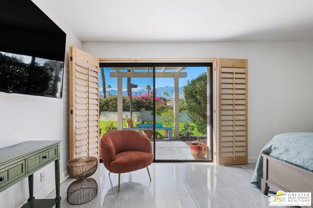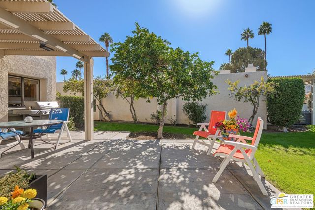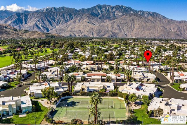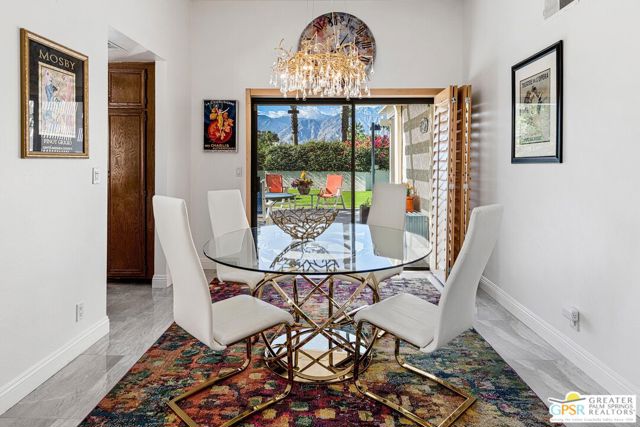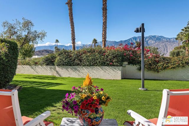 In Tahquitz Creek Villas, one of Palm Springs' best kept secret communities known for its expansive greenways and dramatic mountain backdrop, this home offers easy, bright living. The main spaces sit under vaulted ceilings and across gleaming tile floors, with the living room, dining area, and kitchen flowing together as one continuous, sun-filled environment. A wet bar anchors the gathering area, and the kitchen and dining room windows frame classic views of citrus trees and the western mountains. The dining room opens directly to a deep, pergola-covered patio that looks onto one of the community's most exceptional greenbelt spaces, set against the backdrop of Mt. San Jacinto. Snowcapped peaks are a seasonal treat in the desert, and this home enjoys a front-row seat. The generously sized primary bedroom shares the same outlook and includes an ensuite bath with dual sinks and a walk-in shower. A guest bedroom and full bath sit separately for privacy. An enclosed garage and a Saltillo-tiled carport provide welcome versatility. Tahquitz Creek Villas offers landscaped grounds, pools, a spa, tennis courts, and pickleball, all within a quiet and well-kept Palm Springs enclave.
