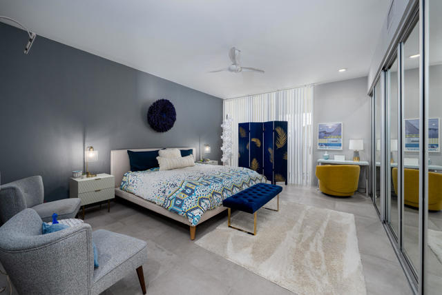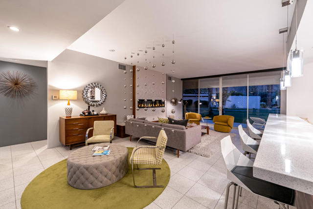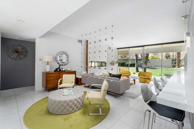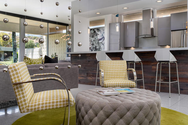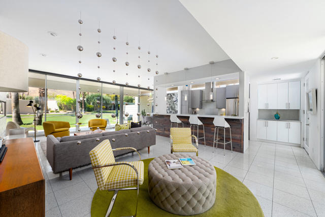 This beautifully remodeled 2bed/2bath home is just waiting for you to call home at the coveted Seven Lakes Country Club. Originally designed by Richard A. Harrison, inside its mod shadow-blocked walls, you'll find a spacious unit updated for today's living. Spread out over the 1,545 sq ft open floor plan, highlighted by light terrazzo tile floors, get ready to entertain in style! The remodeled kitchen is finished with KraftMaid grey cabinetry, sparkling stainless steel appliances, and ample quartz countertops, including a large breakfast bar. Walls of glass sliders open out onto a green leisure terrace with views of the mountains and the iconic Southridge estates. Enclosed for maximum privacy, the northern window wall opens onto a large private courtyard lined with a desertscaped perimeter garden. Both spacious bedrooms offer great closets as well. An assigned two-car garage is available while the tranquil pool is just steps away. The roof has been recently recoated as of July 2025. Past the 24-hour guarded front gate, 'The Gem of the Desert' offers a unique elevated lifestyle with its Ted Robinson-designed 18-hole executive golf course, 15 pools and spas with poolhouses, and the lively William Cody-designed clubhouse with a formal dining room, casual cocktail lounge, and a terrace overlooking the waterfall-fountain. Welcome home!