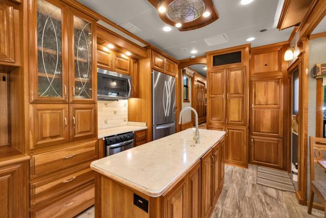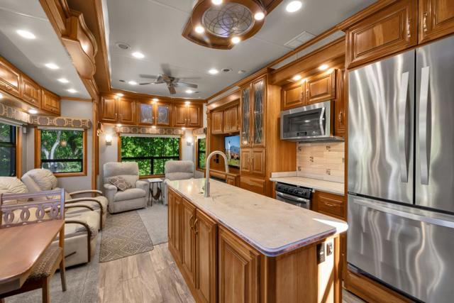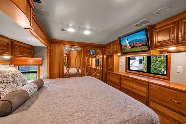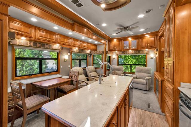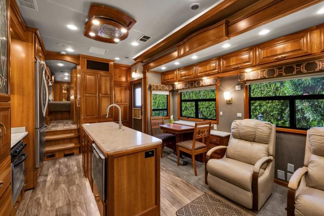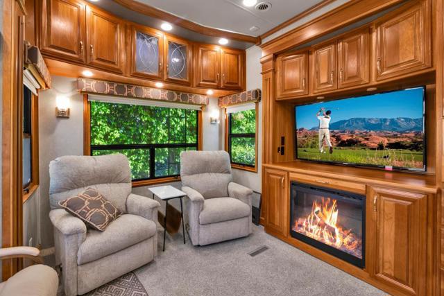 This exceptional corner lot is strategically positioned adjacent to expansive open space, providing an enhanced sense of privacy and tranquility. Its prime location ensures unparalleled convenience, with the starter shack, a satellite pool and spa, and the main clubhouse all within easy walking distance.The lot itself has undergone significant enhancements, featuring a newly expanded 6-inch thick concrete pad. State of-the-art electrical and irrigation systems, alongside premium synthetic turf, ensuring minimal upkeep and year-round aesthetic appeal. Established, mature privacy hedges provide natural shade, further enhancing the comfort and privacy of the space.This complete package includes high-quality patio furnishings, ready for immediate enjoyment. Adding to the package is a pristine 2018 Mobile Suites (DRV38RSB3) luxury recreational vehicle, which has benefited from extensive recent upgrades. These enhancements feature modern recliners and a coordinating side table, a contemporary kitchen faucet, an efficient Maxx fan, fresh roof paint, and new protective rooftop AC covers. Additional improvements contributing to the value and turn-key nature of this package include recently updated stairs, a custom-built doghouse, and modern skirting, all maintained to a high standard.