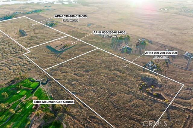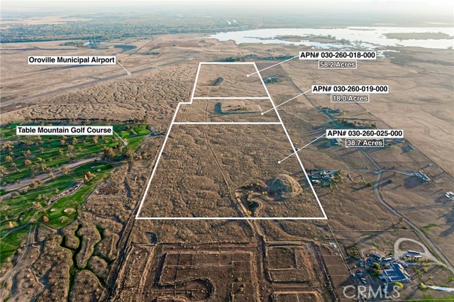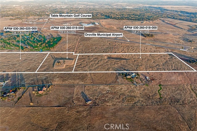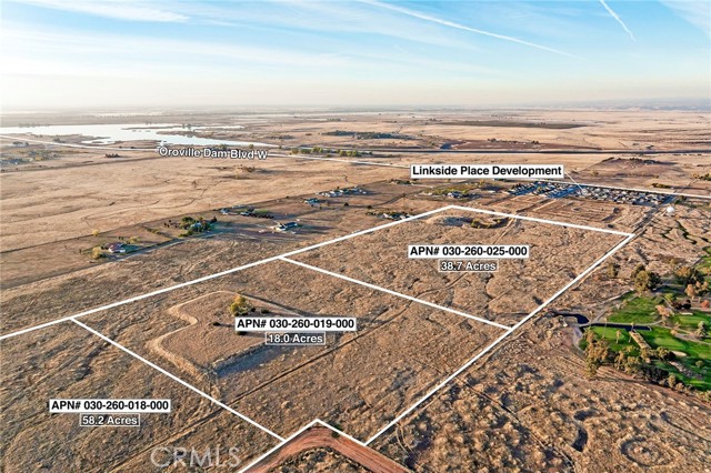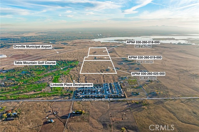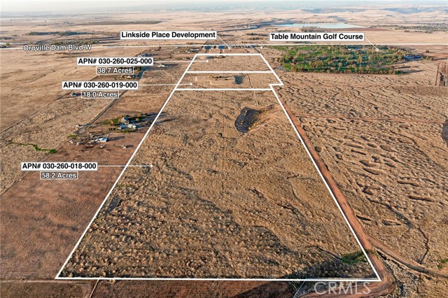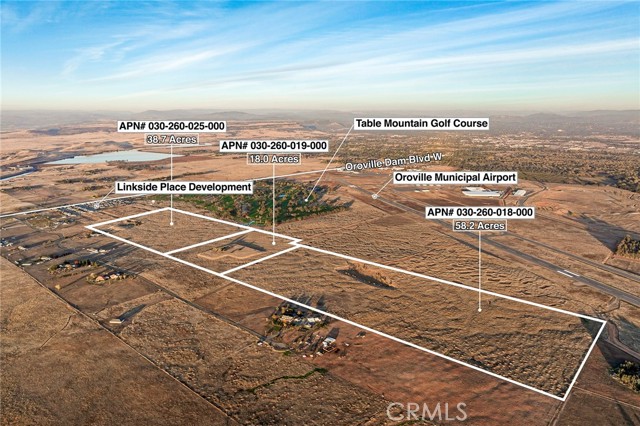 PRIME DEVELOPMENT OPPORTUNITY with this 115± acre land offering located at the edge of the Oroville City Limits and directly adjacent to the 18-Hole Table Mountain Golf Course. Featuring approximately 2,200 feet of golf-course boundary frontage, this property presents exceptional potential for a rural-residential or golf-oriented development concept, including 5-acre estate lots under the current RR-5 zoning. The land borders Linkside Place Phase II to the north, including the tentatively approved Linkside Place Phase II subdivision consisting of 56 future homesites. Phase II has underground utilities already installed and roads graded, awaiting paving, signaling strong forward momentum for continued residential growth in this corridor. Linkside Place Phase I, just north of Phase II, was completed in recent past with 65 homes and demonstrates proven development success in this immediate area. This prime 115± acres is made up of three legal parcels: APN 030-160-019 (18.08± acres), APN 030-260-025 (38.79± acres), and APN 030-260-018 (58.24± acres). Just over 1,000 feet west lies the previously City-approved 421-acre Oro Bay master plan area, once approved for approx. 2,400 homes, showing the long-term development vision for this part of Oroville. Power, water, and sewer currently extend to Linkside Place Phase II at the northern boundary of this property. With Oroville’s growing population, multiple new housing projects underway, and demand for quality development opportunities, this acreage sits directly in the path of expansion. Located just south of Oro Dam Blvd, the main connector between Highways 70 and 99, and approximately 4 miles to downtown Oroville, 25 miles to Chico, and 70 miles to Sacramento. Close to recreation including Lake Oroville, the Feather River, and the Afterbay recreation and boat launch facilities just up the road. Ideal for developers, investors, 1031 exchanges, or long-term land banking. Owner may finance a significant portion—submit terms for seller consideration. Priced at right around $20,000+/- per acre. Inquire with City Of Oroville for discussions on their current plans for this area on Annexation Into City Limits & Potentail Future Rezoning Ideas in conjunction with adjacent developments.