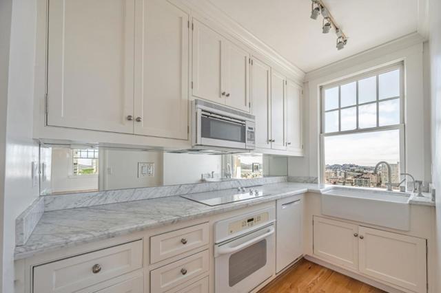 Spectacular 180-degree views of the Golden Gate Bridge, Grace Cathedral, and the San Francisco skyline make this 2-bedroom, 2-bath condo an extraordinary address in Nob Hill. With 1,520 square feet of living space in a full-service luxury building, this home delivers both elegance and convenience at the highest level. The living area makes a striking impression with its scale and light, hardwood floors flowing underfoot, and mirrored walls. The kitchen reflects both elegance and practicality, with custom cabinetry, polished counters, and a timeless layout. A wide window above the sink captures sweeping urban views, ensuring even simple routines feel elevated. Retreat to two serene bedrooms, each with its own bath. The primary suite exudes sophistication with a walk-in closet tailored for organization and an ensuite featuring dual vanities, a soaking tub, and a separate shower. The secondary bedroom offers flexibility, whether reserved for overnight guests or curated as a home office. This is a full HOA-service building with a doorman and dedicated management team. Just steps from local dining and Trader Joes, a short walk to the Financial District, and within fifteen minutes of Fishermans Wharf, this coveted location puts the very best of San Francisco within reach.