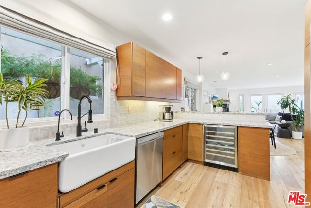 Prime Venice Beach Living! Turnkey Single-Family Home Just 6 Blocks From the Sand. Experience the very best of SoCal coastal living in this beautifully remodeled single-family home, ideally situated in a coveted beachside neighborhood of Venice. Leave the car behind and enjoy effortless access to the vibrant energy of the area, just a short stroll to the newest shops and restaurants, Venice Beach, Mother's Beach, the Marina, Abbot Kinney, the iconic Venice Canals, and more. Step inside to an inviting open-concept great room where French doors blur the line between indoor and outdoor living. Natural light pours into the space, highlighting the wide-plank beach-toned hardwood floors, recessed lighting, custom cabinetry, and a stunning high-end corner gas fireplace. The seamless flow continues to a sun-drenched patio designed for entertaining, complete with a custom built-in BBQ and a lush, private front yard. The updated kitchen is both stylish and functional, featuring granite countertops, stainless steel appliances, a farmhouse sink, breakfast bar, and a wine/beer fridge, perfect for casual mornings or hosting friends. Upstairs, a traditional layout offers all bedrooms on one level. The 4th bedroom/office and rear bedroom enjoy tranquil views of the Santa Monica Mountains. The primary suite is a true retreat, with a cantilevered sitting area boasting water views, a large walk-in closet, and a spa-inspired bathroom with an oversized freestanding tub and a massive walk-in shower with rain fixture and bench. Additional highlights include a direct access private two-car side-by-side parking garage with a huge storage loft, new dual-pane energy-efficient windows, air conditioning, and advanced wireless home features such as keyless entry, security system, Ecobee smart thermostat, and remote garage access.This exceptional home combines thoughtful upgrades, timeless design, and an unbeatable walkable location, offering the quintessential Venice Beach lifestyle in a highly sought-after coastal community.