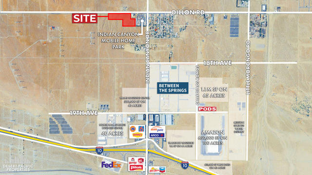 Ideally located just north of I-10 at Indian Canyon Drive just outside the city limits of Palm Springs and Desert Hot Springs. In the Sphere of Influence of Palm Springs. Excellent visibility on Dillon Rd. Prime Industrial Growth Area just north of Amazon's new 650,000+ sq. ft. distribution center currently under construction. First eastbound interchange for the Coachella Valley. Just 6 miles from Palm Springs International Airport.