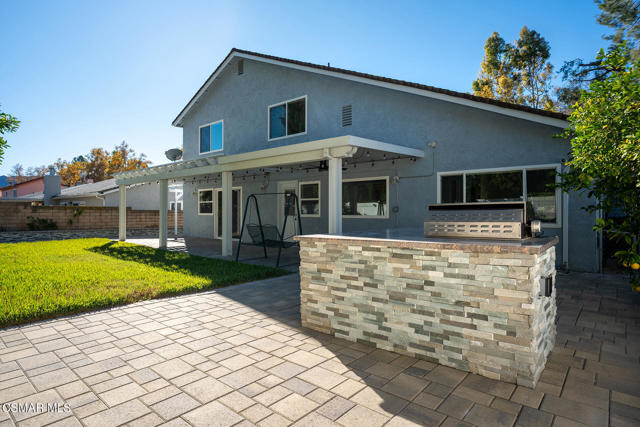 Modern design meets effortless comfort in this expansive 5-bed, 3-bath residence offering 2,399 sq ft of stylish living on a beautifully designed 6,098 sq ft lot. Every space reflects a refined, elevated aesthetic--wide-plank French-oak style flooring, smooth ceilings, curated lighting, and contemporary fixtures create a cohesive, luxury feel throughout the home.The main level features an open layout perfect for both daily living and entertaining. A spacious formal living and dining area is anchored by a custom-built-in buffet with abundant storage--ideal for gatherings and displaying your favorite pieces. The kitchen blends clean lines with thoughtful storage, including custom cabinetry, quartz counters, and efficient organization throughout. The layout allows room for a full-size refrigerator and opens seamlessly to the expansive family room, offering plenty of space for casual dining, conversation seating, or both. Additional storage is thoughtfully tucked beneath the staircase.A private first-floor bedroom and full bathroom with a generous walk-in shower and floating vanity provide flexibility for guests, a home office, or multi-generational living.Upstairs, the serene primary suite offers two closets--one wall-to-wall system with soft-close sliding panels and integrated organization, plus a second closet designed for longer garments and added storage. The en-suite bath features a full wet-room experience with a spacious walk-in shower, two shower heads, and a soaking tub positioned within the same enclosure. A floating vanity and dedicated storage cabinet complete the clean, contemporary design.Three additional bedrooms complete the second level, two featuring the same custom closet organization, including one full walk-in closet. The hall bathroom continues the aesthetic with modern tilework, floating vanity design, and dark, architectural hardware.The three-car garage offers epoxy flooring and a modern garage door with a wall-mounted motor system, maximizing clearance for taller vehicles and creating a streamlined look.Designed for low-maintenance enjoyment, the exterior features attractive hardscaping with pavers, a built-in BBQ, two covered patio areas, and turf in the front yard for year-round curb appeal.