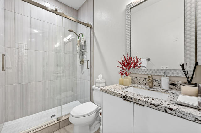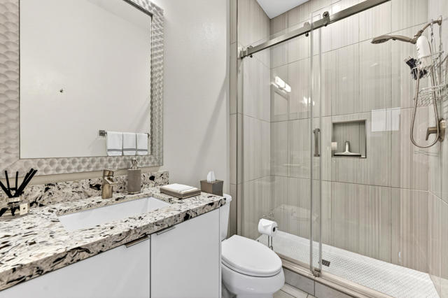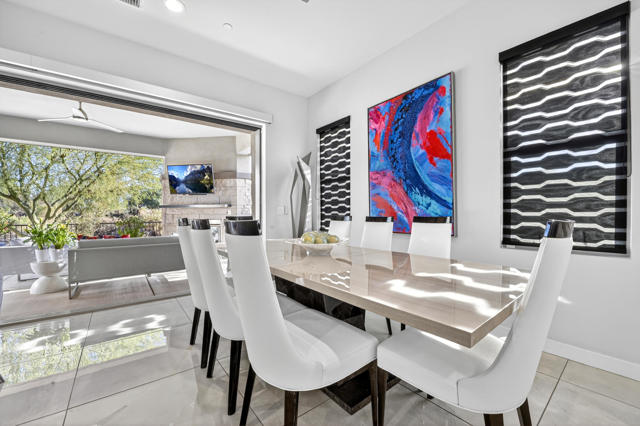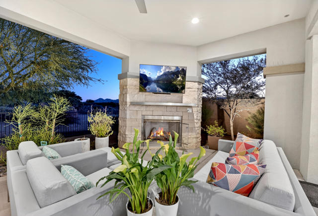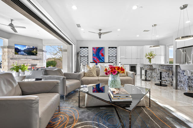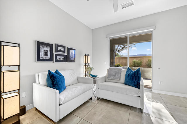 Rare opportunity to own this beautifully upgraded Haven 2 floor plan in the prestigious Retreat at Desert Willow. Perfectly positioned in the community's most desirable location, this contemporary residence offers 2,184 square feet (EST.), 3 bedrooms, 3 bathrooms, and was built in 2018 with exceptional craftsmanship and thoughtful design throughout. Sweeping southern mountain and golf course views create an impressive backdrop, enhancing the home's serene and luxurious ambiance. Inside, refined upgrades abound, including 32x32-inch polished porcelain tile flooring, designer paint, and expansive pocket sliding glass doors that open wide to blend indoor and outdoor living. The chef-inspired kitchen is both stylish and functional, featuring custom soft-closing cabinetry, upgraded quartz countertops, glass tile accents on the island, stainless steel appliances, and a wine cooler--ideal for effortless entertaining. Custom window treatments and ceiling fans add comfort and sophistication throughout the home. All three bathrooms have been tastefully remodeled with enhanced showers, premium tile work, upgraded cabinetry, modern doors, custom mirrors, and elegant arctic polish quartz countertops. The luxurious primary suite offers a serene retreat with a beautifully appointed bathroom and a convenient linen cabinet. Additional highlights include epoxy flooring in the garage along with a Trax storage system and cabinetry. The outdoor covered patio serves as an inviting extension of the living space, complete with a cozy fireplace and mounted TV, making it the ideal spot to unwind while taking in the stunning surrounding views. Life at The Retreat at Desert Willow offers unmatched resort-style amenities including a sparkling pool, lap pool, spa, clubhouse with billiards and ping pong, fitness center, BBQ areas, and a private golf-cart path leading directly to Desert Willow Golf Resort. HOA dues provide incredible value with internet, cable, water, pest control, and trash service, plus exclusive owner perks such as unlimited use of the Desert Willow driving range and access to the Golf Academy. A rare blend of luxury, lifestyle, and breathtaking views--this exceptional home is a must-see for buyers seeking an elevated Palm Desert living experience.