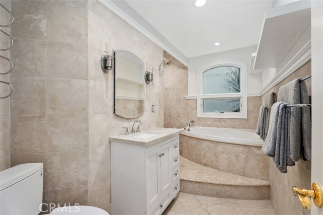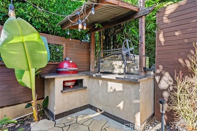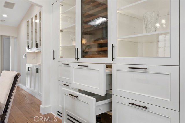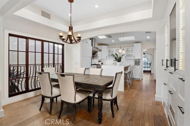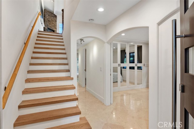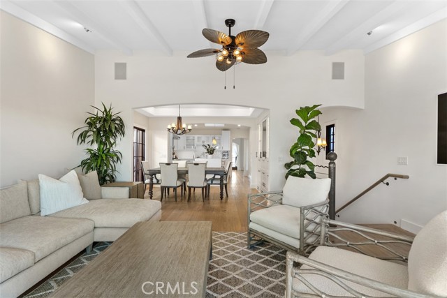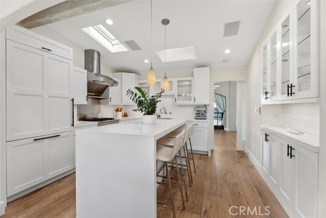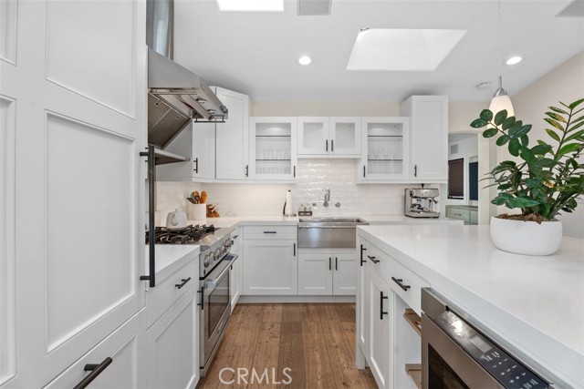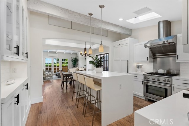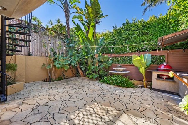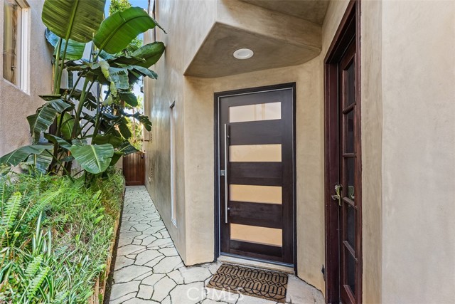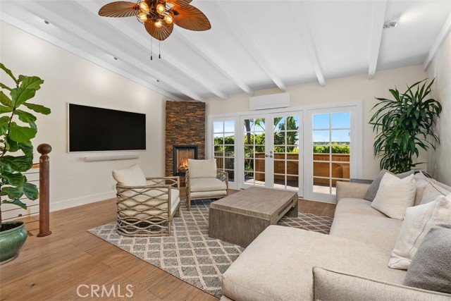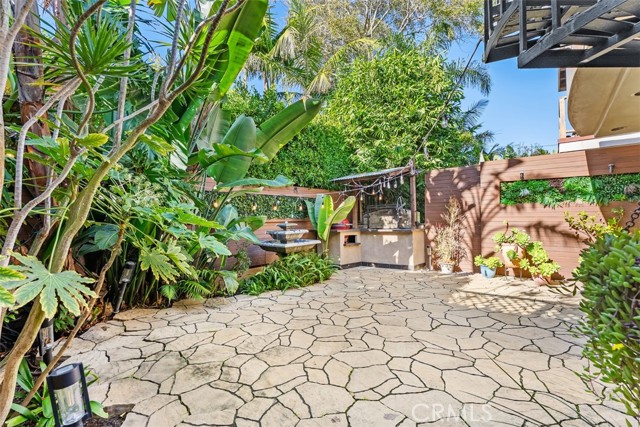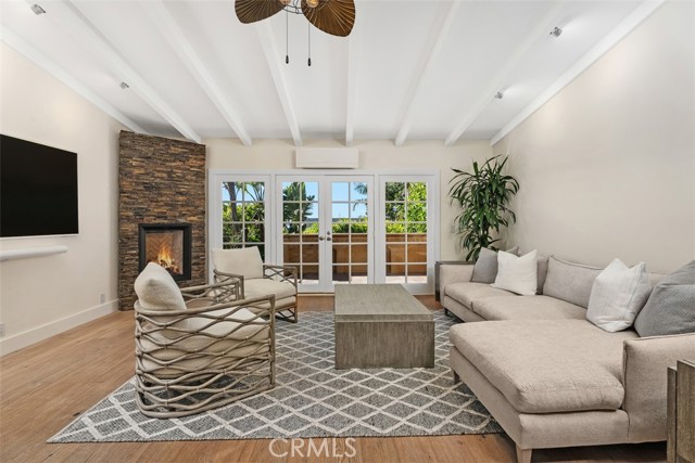 Discover this exquisitely remodeled coastal sanctuary in the desirable hillside community of Arch Beach Heights, where elegance meets European-inspired design. This remarkable 3 bedroom, 2 bath home offers peek-a-boo ocean and canyon views, exceptional craftsmanship, and undeniable charm from the moment you arrive. A stone-paved driveway, lush landscaping, and soft lighting lead to an inviting interior highlighted by authentic limestone and Du Chateau wood flooring. Light, neutral colors enhance the open floor plan. Upstairs, the main living area features vaulted ceilings, a gas fireplace, and double doors opening to an outdoor dining terrace that provides mesmerizing ocean, sunset and Catalina views. The adjacent dining area includes abundant built-in cabinetry with lighted glass display cabinets, a wine refrigerator, and dual Sub-Zero beverage drawers. The Juliet balcony off this beautiful space adds to the charm and entertaining appeal. The open kitchen offers quartz countertops, Blanco sink, Miele dishwasher, Bosch refrigerator, 4-burner gas cooktop with Electrolux convection oven, skylights, under-cabinet lighting, and a center island. Top-quality Sonos system and mounted TVs elevate the entertaining experience throughout the home as well. The spacious primary suite includes built-in closet space, a private viewing balcony, and an updated ensuite with heated towel bars, dual shower heads, and linen storage. The entry level features two additional bedrooms: one with a fireplace, walk-in closet along with double-door access to the rear patio; the other offers a Murphy bed and floor-to-ceiling built-ins ideal for guests or office use. There's also a large secondary bath that offers heated limestone floors, dual shower heads, and an oversized soaking tub. An ultra-private backyard oasis awaits, complete with fountain, Santa Maria grill, Kamado-style smoker, rotisserie, counter space, and multiple areas to relax or entertain. The yard is accessible from the lower level or via a spiral staircase off the family room. Additional highlights include an oversized two-car garage with custom built-ins, storage, and laundry area. Perfectly positioned near Moulton Meadows Park—with tennis courts, playground, large grass fields, and numerous hiking and biking trails—this home is also minutes from downtown Laguna Beach, world-class dining, galleries, shops, and iconic beaches. A refined coastal residence offering the quintessential Laguna Beach lifestyle.