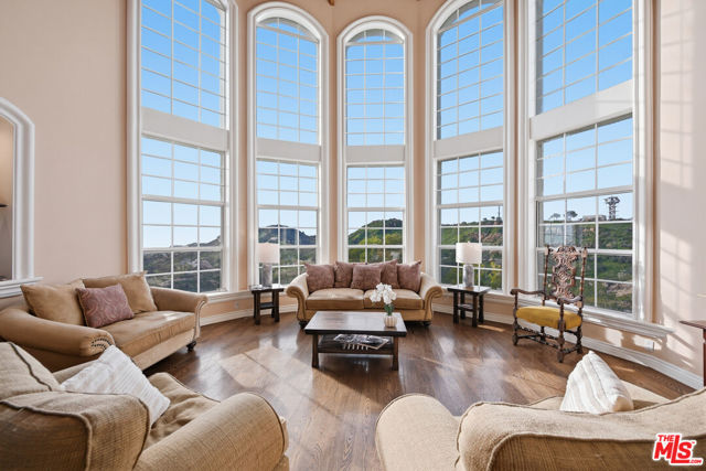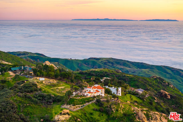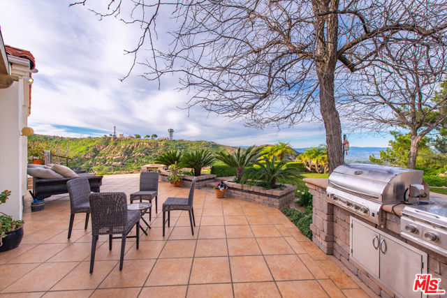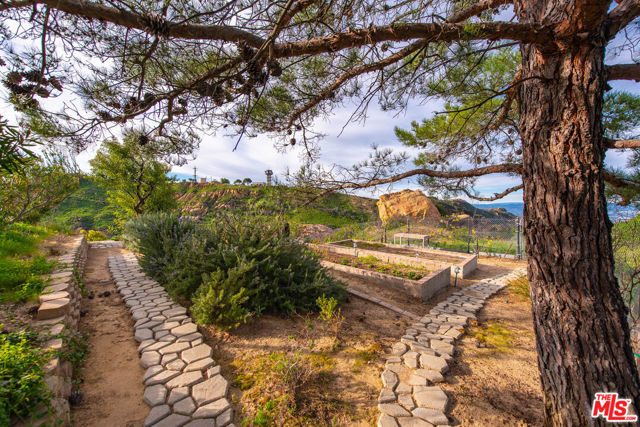 Set on over two acres in a private Topanga setting, on the Malibu border, this expansive single-family residence offers sweeping views spanning from the ocean to the surrounding canyon and valley. Thoughtfully positioned for privacy and positioned behind its own gates, this view-oriented property creates a serene, retreat-like environment.The grand entry leads to a light-filled living room which features an open floor plan with soaring beamed ceilings, floor-to-ceiling windows, and a designated bar, making it a wonderful space to entertain. The chef's kitchen is equipped with high-end appliances, granite countertops, a center island, a wine fridge, and a sunny breakfast area that flows into the adjacent family room. In addition to a private dining room, the entry level also includes 3 bedrooms, one serving as a downstairs secondary primary, a "glass box" office, laundry and 3-car garage. Five bedrooms and four and half bathrooms, spanning over 5,154 sq/ft, provide flexible living options, including a spacious primary suite with a fireplace, private balcony, generous walk-in closet, spa-style bath with custom oversized shower and a sitting room/library which makes a great place to escape for some quiet time. Also on this second level there is an oversized en suite guest bedroom. Great floor-plan! Outdoor amenities include a covered al fresco dining area, built-in BBQ area, designated basketball playing area, plenty of parking, an outdoor hot-tub, large vegetable garden with a variety of fruit trees including citrus, figs and even nut trees. Also worth mentioning there are several lookout platforms with seating, bird/chicken enclosures, and a grassy lawn. The lushly landscaped grounds enhance the sense of seclusion while remaining conveniently located on the border of Malibu & Topanga, giving multiple options to reach downtown Malibu, Ventura Blvd, and the local shops and restaurants in Topanga.