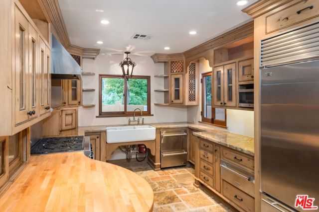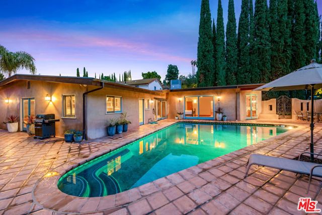Nestled in the exclusive Royal Woods neighborhood of Sherman Oaks, this beautifully reimagined 4-bedroom, 5-bath Spanish-style home offers privacy, character, and exceptional indoor-outdoor flow. Located south of Ventura Blvd, the residence showcases warm luxury with vaulted ceilings, rich woodwork, and an open layout ideal for entertaining.The chef's kitchen features custom cabinetry, high-end appliances, a spacious pantry, and a pass-through window to the patio for effortless alfresco dining. French doors open to a lush, private backyard oasis with mature landscaping, built-in seating, fire pit, and a solar-heated triangle pool with peaceful canyon views. The primary suite is a true retreat with cedar vaulted ceilings, Brazilian cherry floors, a massive walk-in closet, steam shower, and a spa-like bath with jetted tub and bidet. There are two spacious guest bedrooms, a fourth bedroom near a separate entrance, and a light-filled bonus room that could serve as a fifth bedroom all within a flexible layout offering ample space for both relaxation and entertaining. An attached garage, generous storage, and charming architectural details throughout complete this special offering. A rare and soulful home built for both comfort and inspiration. **Some photos are virtual staged.