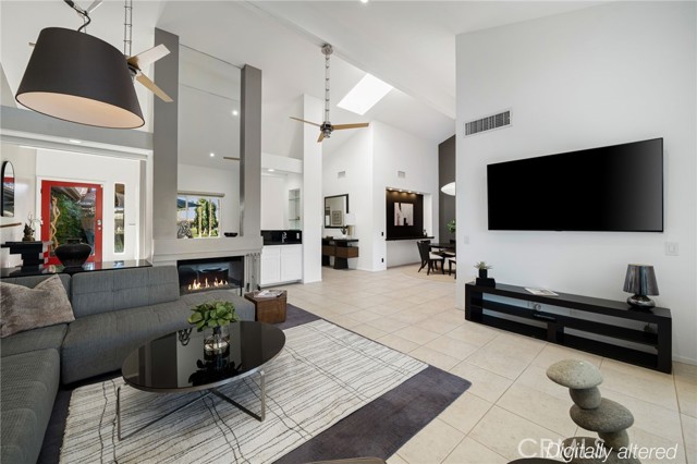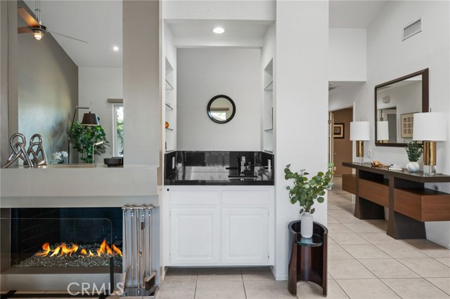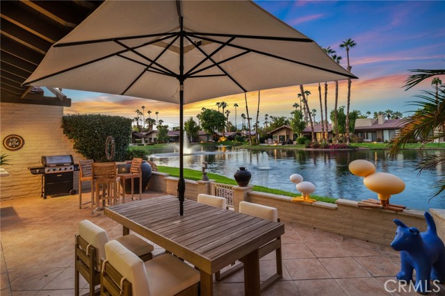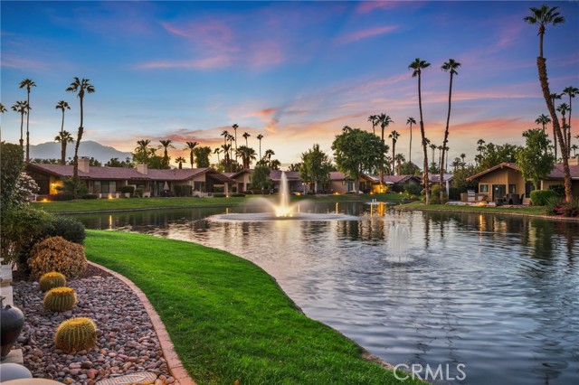 Welcome to The Lakes Country Club, where this sought-after Laramie floorplan delivers contemporary style, serene waterfront living, and gorgeous mountain views. Offering approximately 2,184 sq ft, this beautifully updated home features two bedrooms plus a den, all with ensuite baths, along with a convenient powder room. The impressive kitchen is sleek and modern, showcasing white lacquer cabinetry, stainless steel appliances, and effortless access to the patio—ideal for seamless indoor-outdoor entertaining. The open great room, complete with a cozy fireplace and wet bar, flows into the formal dining area, creating an inviting space for both intimate gatherings and lively entertaining. The former atrium has been thoughtfully transformed into a versatile office or expanded den, which features twin Murphy beds for added flexibility. Move-in ready and furnished in chic, contemporary style, this home invites you to relax, entertain, and fully embrace the Desert lifestyle in a truly sophisticated setting. The Lakes Country Club offers a robust schedule of social and fitness activities at the exquisite Clubhouse and Health and Wellness Center. Enjoy Tennis, Pickleball or Pop Tennis, Bocce or the 44 community pools and spas. For golfers, the Club offers membership options for the 27 hole championship golf course.