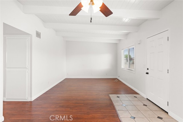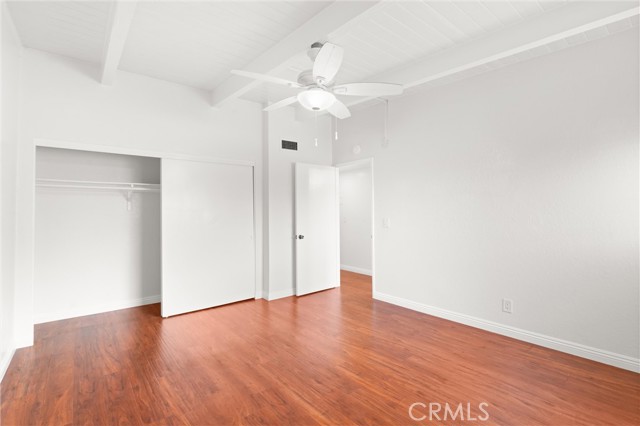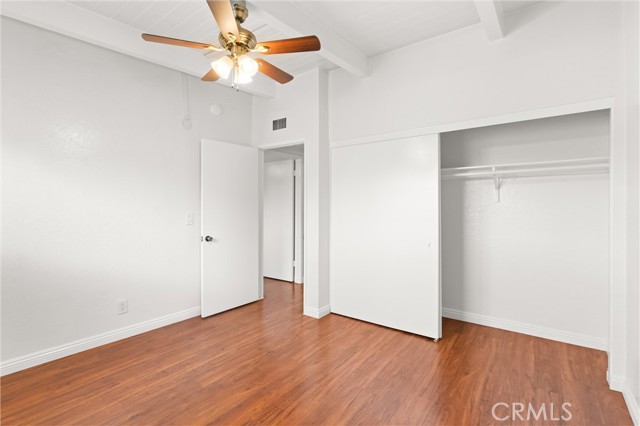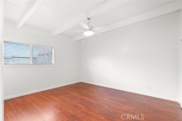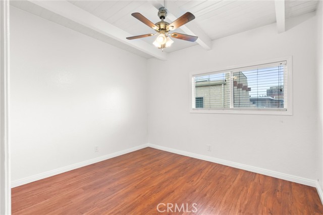 Welcome to your cozy coastal home in Huntington Beach! Conveniently located just blocks from the beach and downtown, this welcoming 2-bedroom, 1-bathroom residence offers a peaceful retreat. Situated on the top floor, enjoy the added privacy with no neighbors above and higher beamed ceilings throughout. Step inside to an inviting open layout connecting the living area, dining room, and kitchen. The kitchen features quartz countertops, a dishwasher, gas stove/oven, and plenty of storage space. Throughout the home, you'll find vinyl flooring and central heating. Each room includes a ceiling fan, spacious closets, and blinds for every window. For your convenience, there are onsite laundry facilities and one locked garage parking space, plus one uncovered space per tenant. Rent covers water and trash; tenants are responsible for electricity, gas, and internet. Welcome home!