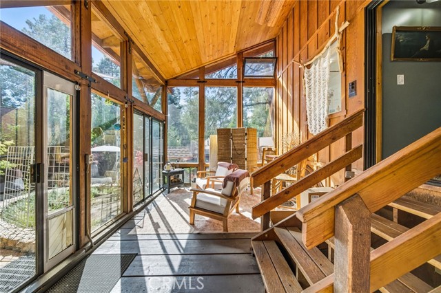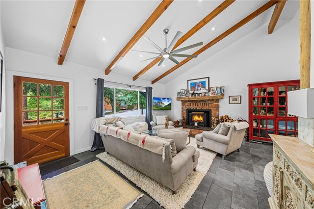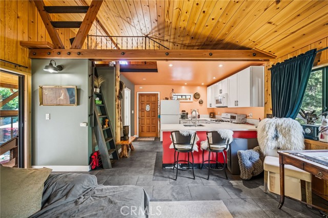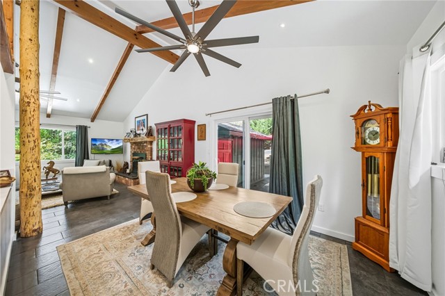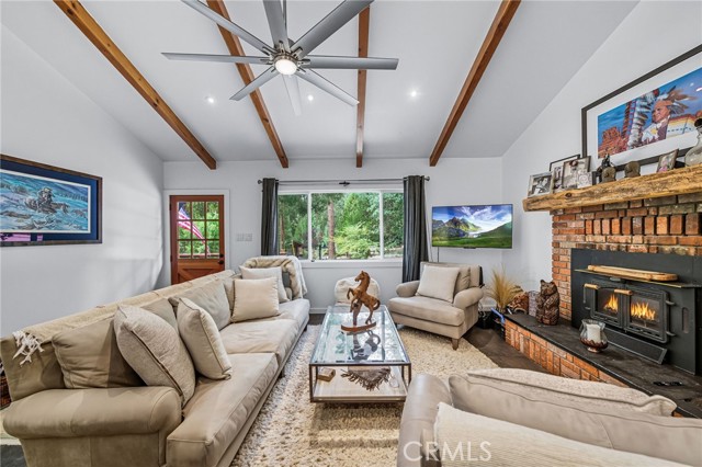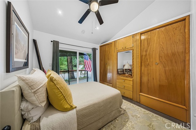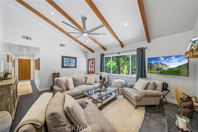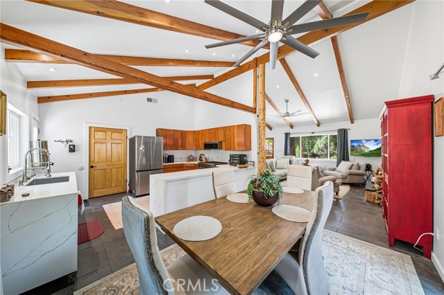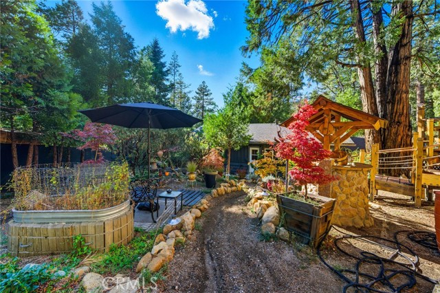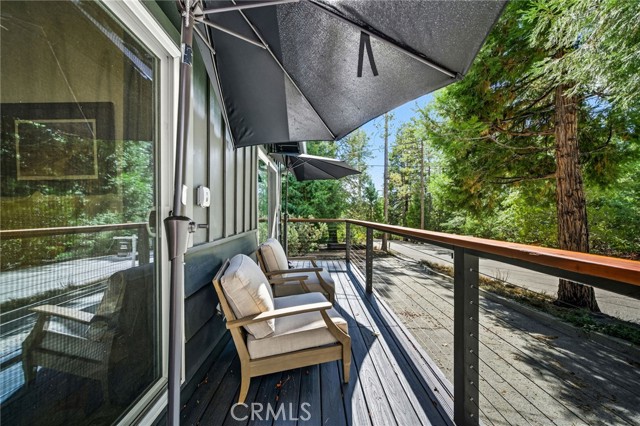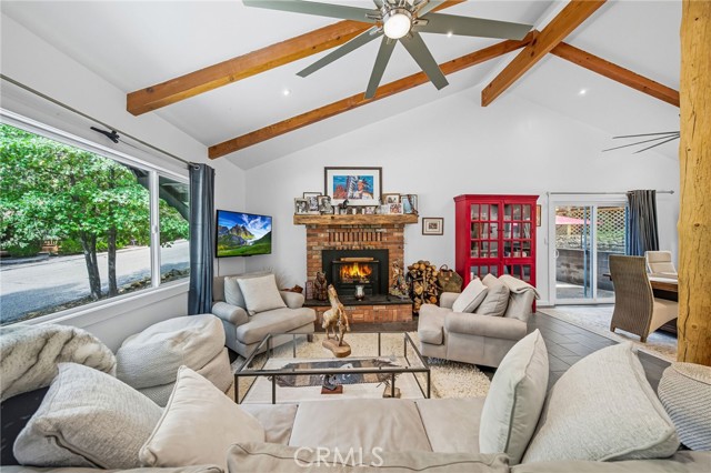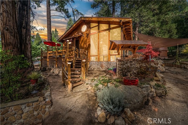 Discover a truly enchanting mountain retreat at 25106 Rim Rock Rd, nestled in the serene Fern Valley of Idyllwild. This exceptional property offers two remodeled, rustic modern cabins on a spacious .51-acre lot, providing the perfect escape for the entire family. The main cabin is a charming 3-bedroom, 1.75-bath home featuring vaulted and beamed ceilings that create an airy, open feel. The living room, with its cozy brick fireplace, flows into the dining area and an updated kitchen complete with stunning waterfall-edge counters and ample cabinetry. Sliders from each bedroom bring the fresh mountain air indoors. Step outside and you'll find a truly magical guest house with 2 bedrooms, 2.75 baths, and a sleeping loft, perfect for hosting guests or a rental. An incredible atrium floods the space with natural light and opens to an oversized backyard where you'll discover a whimsical mushroom play structure—fun for all ages! The property also includes an outbuilding for storage, a 1-car garage, and breathtaking views of Suicide and Lily Rocks. Both homes have been thoughtfully updated with a new 40-year roof on the main house, new electrical panels, updated septic systems (two septic tanks, one for the front house, one for the back), and air conditioning. Additional upgrades include a tankless water heater, new decks and railings, and a host of other improvements that make this a turnkey property. Don't miss this opportunity to own a one-of-a-kind Idyllwild gem!