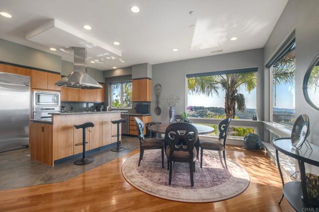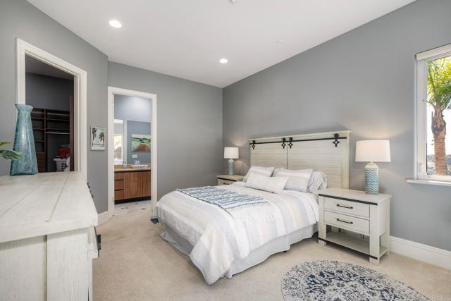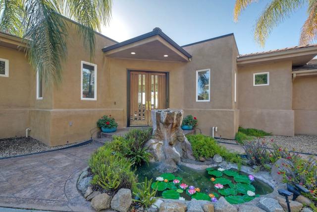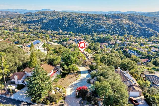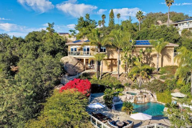 Perched high in the boulders of Hidden Meadows, this custom home feels like you’re living above it all—literally. From sunrise to sunset, the soaring panoramic views stretch across rolling hills to the ocean and islands beyond. These are the kind of huge views that make every day at this incredible Propertunity feel like a vacation! The stylish and smart floor plan flows effortlessly from room to room. The interior features rich wood flooring, lots of natural sunshine, and recessed lighting. The kitchen and living room open to a large view deck, perfect for morning coffee, sunset dinners, or an evening glass of wine while the sky puts on a show. The living room is anchored by a gorgeous fireplace with modern stone surround, while the kitchen boasts handsome wood cabinetry, granite counters, and gleaming stainless steel appliances. The primary suite is a retreat of its own, complete with private deck access, a romantic fireplace, a spa-like ensuite bath, and the spacious custom closets you’ve always dreamed of having. The lower level boasts a versatile den or office area with its own fireplace, built-in wood shelves, and desk nook, and access to the pool/patio area via elegant glass French doors. Two large ensuite bedrooms (primary-like in size, with walk-in closets) and an additional theatre room (currently configured as an office and home gym, could be optional 4th bedroom) on this level offer extra flexibility for guests or multi-gen living. Outdoors, you'll be living the entertainer’s dream with a resort-style pool featuring a tranquil view spa, plus a waterfall you can actually sit beneath—equal parts fun, relaxing, and unforgettable. The property is fully fenced and gated, giving your dogs space to roam and live their best life while you enjoy the privacy of a quiet cul-de-sac location in one of North County's most desirable neighborhoods. Community roads have recently been refreshed! The oversized three-car attached garage with epoxy floors and drop-down ladder offers ample storage, while thoughtful details throughout the property reflect quality construction and pride of ownership. The home is on sewer and propane, a major plus for the area, with very low HOA dues. No Mello-Roos! Brand-new 75-gallon water heater just installed! Practicality meets peace of mind with fresh pre-listing property and termite inspections ready to go, along with title, NHD, and seller disclosures available upfront—so you can move forward with ultimate peace of mind. And while the setting feels wonderfully private, you’re just minutes from I-15, connecting you easily to shopping, dining, wineries, and the coast. Whether you’re floating in the pool beneath the waterfall, sipping wine on the deck as the sun dips toward the ocean, or enjoying the quiet calm of this special neighborhood, 28521 Gladstone invites you to slow down, breathe deeper, and live that beautiful North County life!
