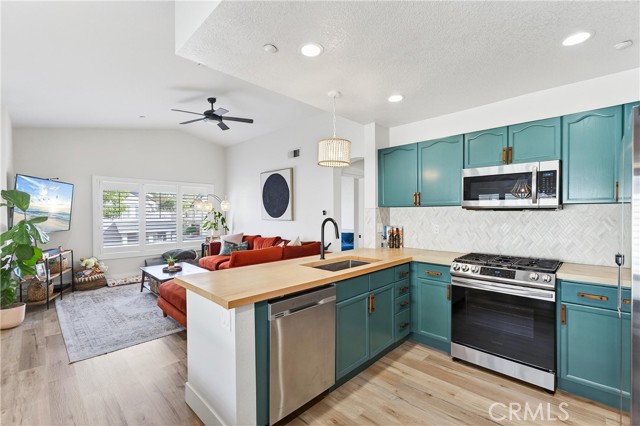 Welcome to this bright and comfortable upper-end condo located in the gated Huntington community of Orange. Offering 2 bedrooms, 2 bathrooms, and 958 square feet of well-designed living space, this home features an open floor plan with vaulted ceilings and a transom window that fills the interior with natural light. Built in 1996, the unit includes a spacious living area, a practical kitchen layout with upgraded appliances and butcher block cabinets. The private primary suite features a walk-in closet, remodeled bathroom and balcony. Other features include inside laundry, update hall bathroom and shutters. The detached 2-car garage is a standout feature, providing secure parking and additional storage. Residents enjoy access to a community pool, clubhouse, and beautifully maintained grounds, and HOA paid internet. Conveniently situated near schools, shopping, restaurants, and easy 55 Freeway access, this home offers comfort, privacy, and everyday convenience in a desirable Orange County location.