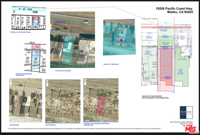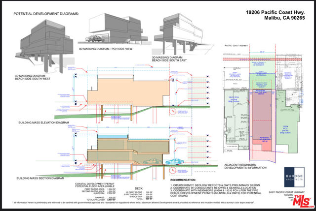 One of the largest beachfront parcels along this top-tier stretch of Malibu shoreline, offering a rare opportunity to rebuild after the Palisades Fire. This oceanfront lot provides direct beach access and sweeping coastline views, with an exceptional location just minutes to Santa Monica, Pacific Palisades, and West L.A., while close to Nobu, Soho House, the Malibu Pier, Mid-Malibu, and renowned dining, shopping, and surf breaks. Seller has engaged acclaimed Malibu architect Doug Burdge, AIA (Burdge Architects) to prepare a preliminary, non-binding development study presenting two conceptual approaches: Option A contemplates a full rebuild requiring a complete CDP and other approvals, with an estimated potential of approximately 2,600 SF (rough estimate only; subject to verification and all required agency review/approvals). Option B contemplates a 110% rebuild scenario of approximately 800 SF plus a two-car garage as a potential lower-budget path (also subject to verification and all required approvals). Disclosures / Buyer Notice: Property is offered as-is. No permits, approvals, or entitlements are included only a preliminary development study. Buyer to conduct all independent investigations and due diligence regarding rebuild rights and feasibility, including (without limitation) Coastal Commission/City requirements, CDP and other permitting, zoning/setbacks/height limits, utilities and service availability, geotechnical conditions, shoreline/coastal hazards, and City/Fire rebuild guidelines. Photos and any conceptual renderings are for illustrative purposes only and have not been approved by any agency. Neither seller nor broker makes any representations or warranties as to lot dimensions, prior structure size, utility connections, buildable area, or future development potential; all information to be verified by buyer.