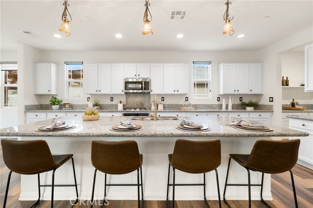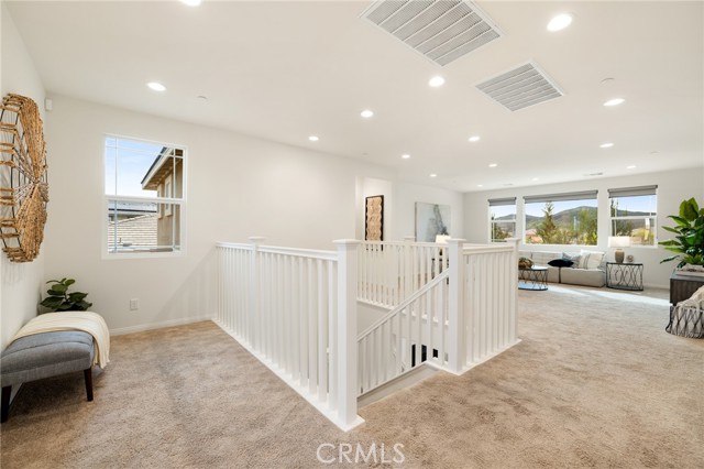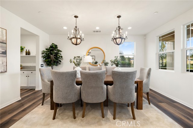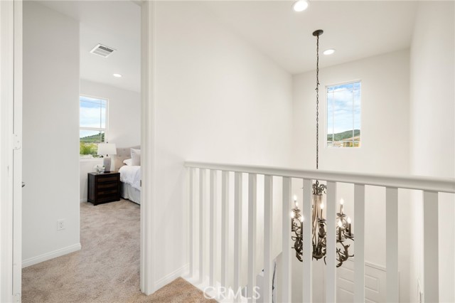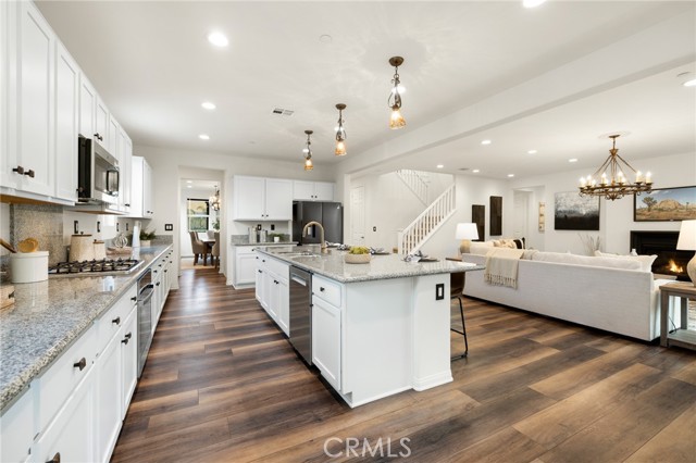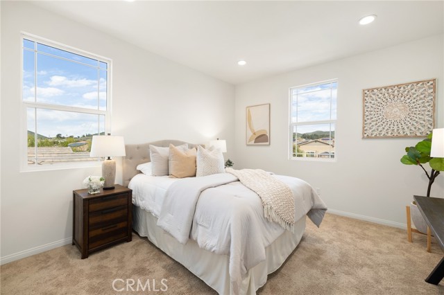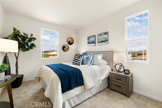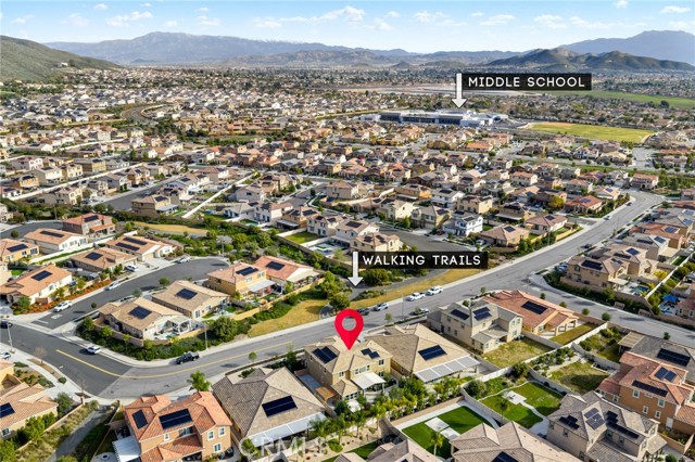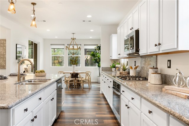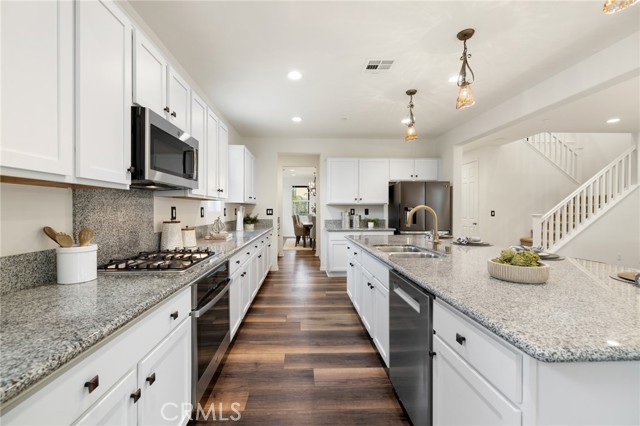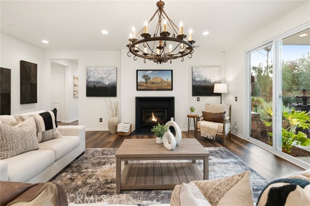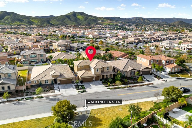 Built in 2021 and showcasing $150,000 in upgrades, this nearly 3,900 sqft residence blends modern elegance with warm sophistication in the highly desirable community of Audie Murphy Ranch. Set on a 7,457 sqft lot with mountain views, solar, and a 3-car garage with EV charger, this home offers exceptional space and thoughtful design. Fresh white paint, LVP flooring throughout the first floor and abundant natural light create a warm atmosphere from the moment you enter. A grand entryway with a statement chandelier opens directly into a spacious formal dining area that connects to both the walk-in pantry and gourmet kitchen, creating a smooth and functional flow. The kitchen boasts granite counters, white cabinetry, upgraded hardware, stainless steel appliances, a large eat-up island with pendant lighting, and seamlessly flows into the rare morning-room addition, which provides extra dining space and additional backyard access. The kitchen transitions seamlessly into the great room, centered around a gas fireplace, custom chandelier, and double slider that brings the indoor and outdoor spaces together. A flex room sits just off the main living area, ideal for an office or optional 5th bedroom, as well as a guest bath, laundry room, mudroom with built-in storage, and garage access to complete the main floor. The second level opens with two secondary bedrooms positioned near a full bath appointed with dual sinks and shower-tub combo. Just beyond this area, another spacious secondary bedroom includes a walk-in closet and its own ensuite bath with a walk-in shower. The expansive loft is set just off this ensuite bedroom, creating a layout that functions as a central gathering space with abundant natural light and elevated views. The luxurious primary suite extends off the loft and features a beautifully appointed ensuite with tile floors, quartz counters, a dual-sink vanity, oversized super shower with custom tile, and a spacious walk-in closet. Plush carpet enhances all bedrooms and the loft, adding comfort throughout the living areas. The backyard feels like a private retreat with a spacious covered patio, stamped concrete, mature trees and drought-tolerant landscaping offering total privacy, a custom fireplace and an above-ground spa with its own patio cover. Community amenities include a clubhouse, pools, sports parks, trails, skate park, and all conveniently located near the award winning Taawila ES and Kathryn Newport MS and between the 15 and 215 freeways.