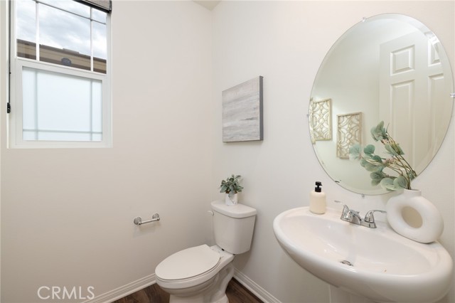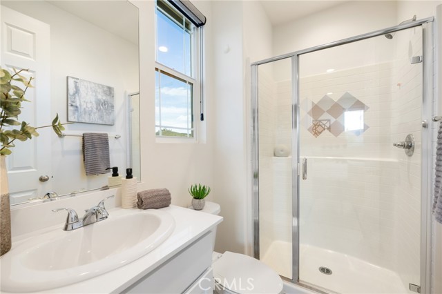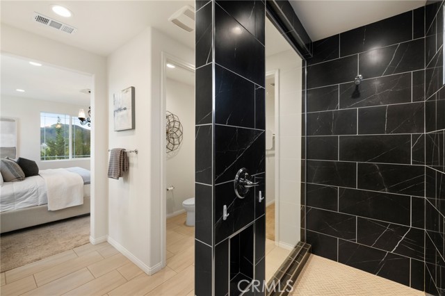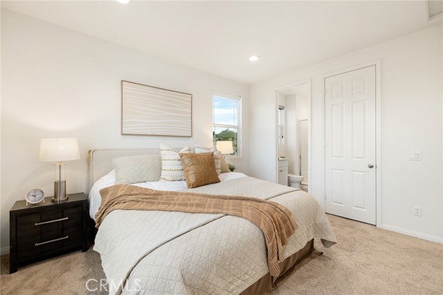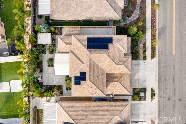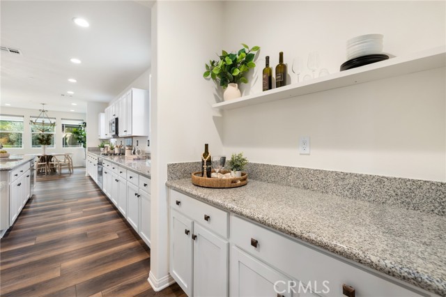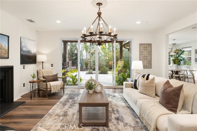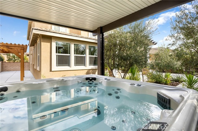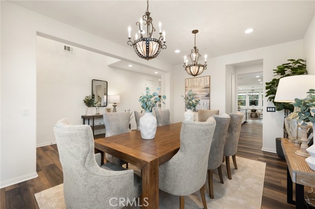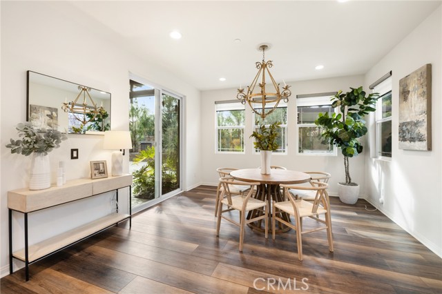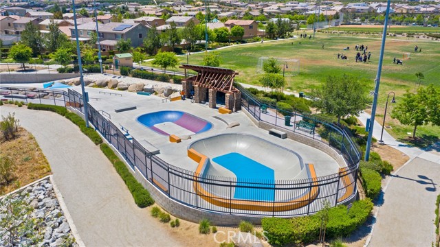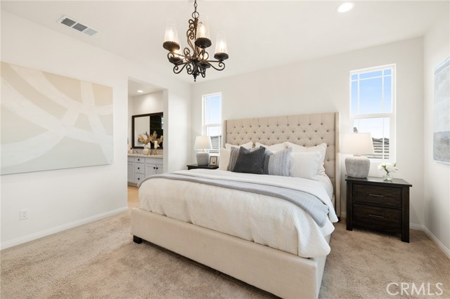 Built in 2021 and showcasing $150,000 in upgrades, this nearly 3,900 sqft residence blends modern elegance with warm sophistication in the highly desirable community of Audie Murphy Ranch. Set on a 7,457 sqft lot with mountain views, solar, and a 3-car garage with EV charger, this home offers exceptional space and thoughtful design. Fresh white paint, LVP flooring throughout the first floor and abundant natural light create a warm atmosphere from the moment you enter. A grand entryway with a statement chandelier opens directly into a spacious formal dining area that connects to both the walk-in pantry and gourmet kitchen, creating a smooth and functional flow. The kitchen boasts granite counters, white cabinetry, upgraded hardware, stainless steel appliances, a large eat-up island with pendant lighting, and seamlessly flows into the rare morning-room addition, which provides extra dining space and additional backyard access. The kitchen transitions seamlessly into the great room, centered around a gas fireplace, custom chandelier, and double slider that brings the indoor and outdoor spaces together. A flex room sits just off the main living area, ideal for an office or optional 5th bedroom, as well as a guest bath, laundry room, mudroom with built-in storage, and garage access to complete the main floor. The second level opens with two secondary bedrooms positioned near a full bath appointed with dual sinks and shower-tub combo. Just beyond this area, another spacious secondary bedroom includes a walk-in closet and its own ensuite bath with a walk-in shower. The expansive loft is set just off this ensuite bedroom, creating a layout that functions as a central gathering space with abundant natural light and elevated views. The luxurious primary suite extends off the loft and features a beautifully appointed ensuite with tile floors, quartz counters, a dual-sink vanity, oversized super shower with custom tile, and a spacious walk-in closet. Plush carpet enhances all bedrooms and the loft, adding comfort throughout the living areas. The backyard feels like a private retreat with a spacious covered patio, stamped concrete, mature trees and drought-tolerant landscaping offering total privacy, a custom fireplace and an above-ground spa with its own patio cover. Community amenities include a clubhouse, pools, sports parks, trails, skate park, and all conveniently located near the award winning Taawila ES and Kathryn Newport MS and between the 15 and 215 freeways.