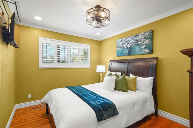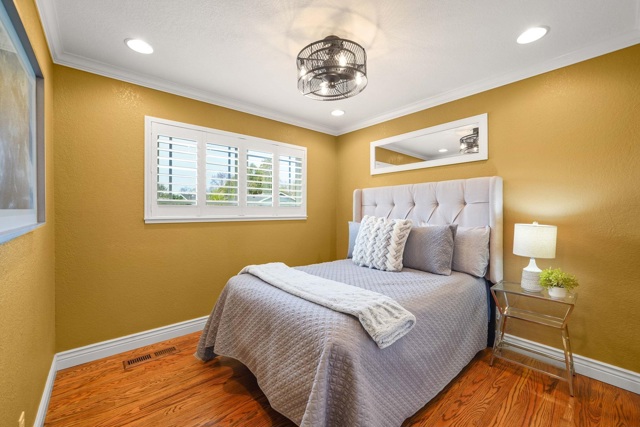 Welcome to this beautifully updated single-level 4-bedroom, 2-bath home on a corner lot in the heart of Fremont within a top-rated school district. The spacious, light-filled living room features recessed lighting, hardwood floors, and crown molding. The chef’s kitchen offers a Dacor 6-burner gas range with professional hood, built-in GE Profile microwave and oven, stainless steel appliances, stone countertops, full-wall backsplash, under-cabinet lighting, abundant cabinetry, a 4+ seating breakfast bar, and adjacent dining area. The family room has built-in shelving, a wood-burning fireplace, and sliding door access to the backyard. The primary suite includes a wall of closets and updated ensuite with tiled shower and stone vanity, while secondary bedrooms share a hall bath with jetted tub/shower. Enjoy a quiet backyard with patio, grass, and a separate space with storage shed and side access. Additional features include central A/C, ceiling fans, dual-pane windows, and shutters. Convenient to shopping, dining, top-rated schools including Oliveira Elementary, Thornton Junior High, and American High School, and easy access to Dumbarton Bridge, I-880, Tesla, Meta/Facebook, and Amazon.