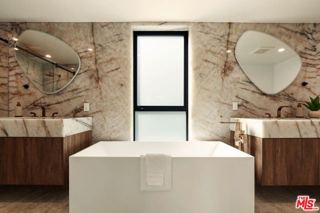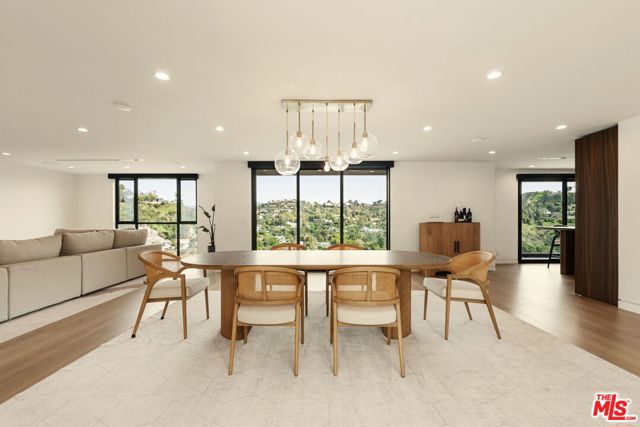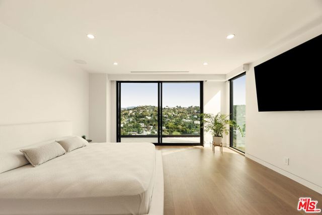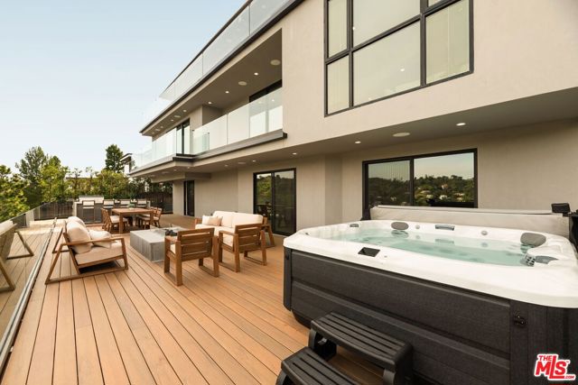 Located in the coveted Mount Olympus neighborhood of the Hollywood Hills, this completely remodeled 4-bedroom, 4.5-bath modern home offers spectacular city and canyon views in a serene setting. The open floor plan is designed for both everyday living and entertaining, featuring a gourmet kitchen with all Miele appliances, a built-in espresso machine, custom Italian cabinetry by Molteni & C, and Taj Mahal marble countertops and a breakfast bar for casual dining. The open floor plan includes a dining area and living room with a fireplace, opening to balconies offering views from every room. The downstairs level opens to a brand-new deck with a spa, fire pit, and outdoor kitchen complete with a built-in BBQ, cooktop, refrigerator, and new teak furnishings. There is a den/ office and a steam shower to use after a workout in your own personal gym. All main bedrooms are located on the top level - primary suite and secondary bedrooms feature custom walk-in closets, while spa-inspired baths include high-end stone finishes and heated floors. Additional highlights include real hardwood floors, built-in Sonos speakers, motorized Lutron shades, a workout room, movie theater/media room, security system, and two electric vehicle charging stations. Prime location in Los Angeles offering privacy and tranquility, yet just moments from the Sunset Strip and city conveniences.