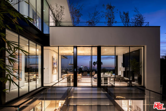 Exceptional design meets refined luxury in this brand-new Beverly Hills architectural masterpiece, set behind privacy gates on a secluded promontory with truly explosive panoramic city-to-ocean views offering the rare combination of dramatic vistas and effortless convenience just moments from the Beverly Hills Hotel and the heart of the city. Created by renowned architect Paul McClean with interiors by Waldo Fernandez, this one-of-a-kind residence is a study in meticulous craftsmanship and elevated modern warmth. Behind the gates, twin marble waterfalls frame a dramatic entry, leading to illuminated travertine paths and a striking glass bridge that reveals the home's stunning three-level design. Walls of glass, soaring wood-paneled ceilings, and contrasting accents create a seamless indoor-outdoor flow reminiscent of the world's finest private resorts. An elevator services all levels, enhancing ease and livability throughout. The main level features formal living and dining areas, a kitchen as well as a chef's kitchen with Miele appliances, wine cellar, and private office. Pocketing glass doors open to an expansive outdoor oasis with a full-length infinity pool, jacuzzi, baja ledge, and multiple dining and lounge areas overlooking the skyline ideal for hosting events, parties, and effortless gatherings with quick access for Uber and pick-ups. The upper level is dedicated to a serene primary retreat with a terrace, fireplace, spa-like bath, and dual closets, as well as a secondary bedroom. Below, a dramatic atrium anchors a complete entertainment and wellness floor with guest suite, gym, sauna, steam room, massage room, onyx bar, and a state-of-the-art private home theater - creating the ultimate "vacation-at-home" lifestyle. The home offers exceptional gated parking capacity, including an oversized garage and additional space within the motor court, providing rare flexibility for events, staff, and guest arrivals, all complemented by generous street frontage for convenient overflow parking. A rare opportunity to own a true trophy property offering unparalleled design, privacy, resort-level amenities, and unmatched proximity to the very best of Beverly Hills.