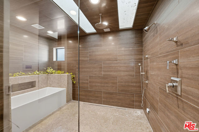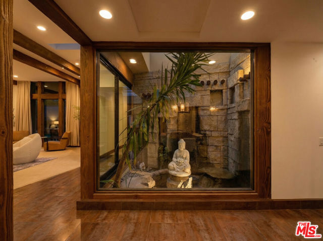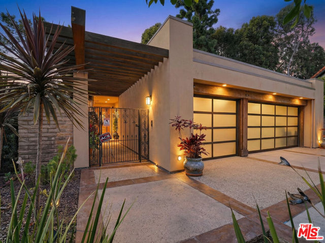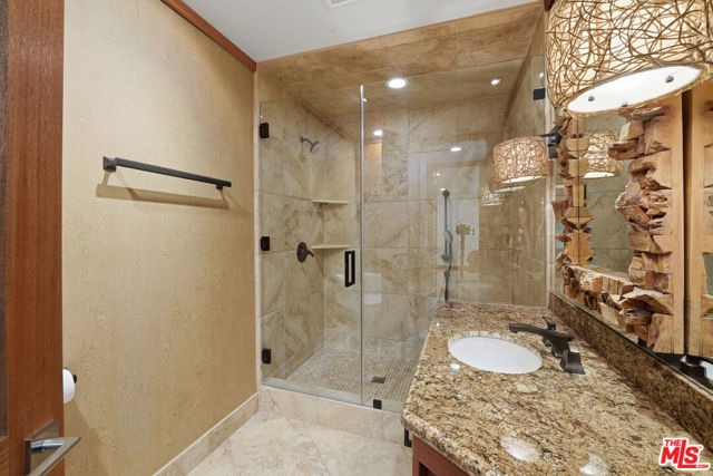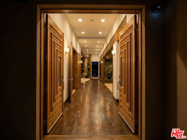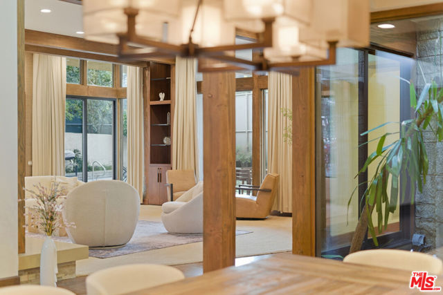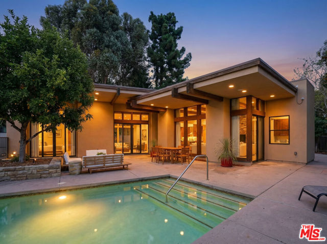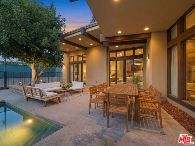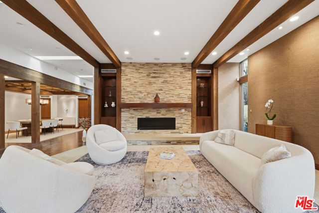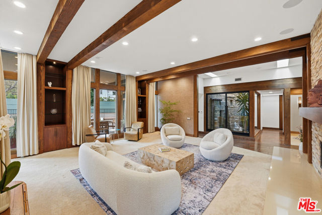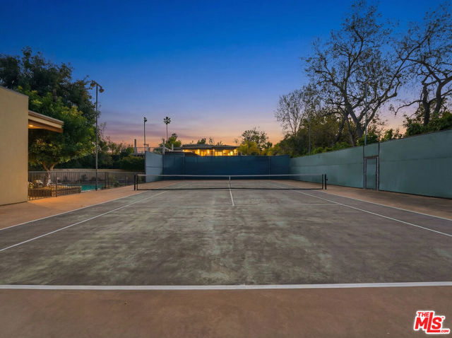 Welcome to a rare architectural masterpiece in the heart of prestigious Amestoy Estates. Rebuilt in 2014, this single-story mid-century modern estate blends timeless design with today's most refined luxury, offering an unparalleled living experience on a private cul-de-sac. Spanning approximately 3,835 square feet, this four-bedroom, three-and-a-half-bath residence is a true showpiece of craftsmanship and intention. Exposed wood beams, clerestory windows, skylights, coffered ceilings, and exquisite inlaid wood details create a warm yet sophisticated atmosphere, while stacked stone facades and designer lighting elevate every space. At the heart of the home, the great room flows effortlessly into a stunning open-air atrium with cascading waterfalls and lush greenery. A serene, resort-style focal point that blurs the line between indoor and outdoor living. Custom built-in cabinetry, stone slab countertops, and heated floors reflect a level of quality rarely found. The gourmet kitchen is a chef's dream, featuring premium Thermador appliances, a dual-oven gas range with custom hood, two wall ovens, built-in refrigerator and dishwasher, walk-in pantry, and elegant finishes ideal for both entertaining and everyday living. A sophisticated wine bar completes the experience. The primary suite is a private sanctuary with its own fireplace, spa-inspired bath with jetted soaking tub and steam shower, and luxurious finishes throughout. Three additional bedrooms offer walk-in closets with cedar paneling and automated lighting, providing both beauty and function. Modern comforts include solar panels, a whole-house water filtration system, dual tankless water heaters, dual HVAC systems, a dedicated utility room, and a three-car garage with epoxy flooring and custom storage cabinetry. Step outside to your private resort-style backyard, where a full tennis court easily converts for pickleball or basketball, alongside a sparkling pool perfect for both active living and elegant entertaining. This is not simply a home, it is a statement of lifestyle, design, and distinction. A one-of-a-kind opportunity in one of Encino's most coveted neighborhoods.