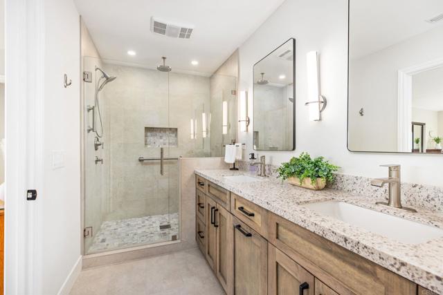 Serene Single-Story Custom Retreat with Panoramic Views & Paid-Off Solar with battery! Welcome to 13065 Via Sueña, a true single-level custom home on 2.51 acres in desirable West Valley Center. Designed for comfort, accessibility, and effortless living, this meticulously maintained 3-bedroom, 2.5-bath home offers 2,335 sq. ft. of light-filled space with NO interior steps. From the garage, front courtyard, and throughout the interior to the back patio, the entire main living area is on one level. Wide hallways, and a thoughtful layout offer a seamless indoor-outdoor flow, ideal for buyers seeking a peaceful, single-story lifestyle. While the property slopes to a lower area, all daily living spaces remain fully single-level. Built with solid 2x6 construction and a west-facing orientation, the living room, family room, kitchen, and primary suite enjoy sweeping panoramic views and stunning sunsets. Enjoy indoor-outdoor living from the tranquil front courtyard, rear patio, or lower sitting area. Whether you’re enjoying your morning coffee, unwinding at sunset, or entertaining friends, the scenery will take your breath away day after day. This all-electric home features an owned solar system with 34 panels and a Tesla Powerwall, covering nearly all annual energy usage. Additional features include a solar water heater, QuietCool whole-house fans, a wood-burning stove, and a living room fireplace with heatilator. The primary suite includes a walk-in closet and remodeled bath with quartz counters, ceiling heating and fan, dual shower heads, and soft-close cabinetry. The kitchen offers sunset views, a large center island, pull-out storage, direct patio access, and a pocket door to the dining room. Outside, a 20’ x 30’ detached outbuilding with water, lighting, roll-up door, and 30-amp sub-panel offers endless possibilities—workshop, storage, studio, or future ADU. The usable lot includes a fully fenced backyard, mature fruit trees (naval orange, lemon, grapefruit, tangelo), RV parking options, two driveways, ample parking, and beautiful rock walls made of local stone. Minutes from I-15, shopping, dining, and golf, this private retreat offers rural tranquility with modern convenience and no HOA. Buyers seeking a peaceful, private, single-story home with gorgeous views won’t want to miss this.
