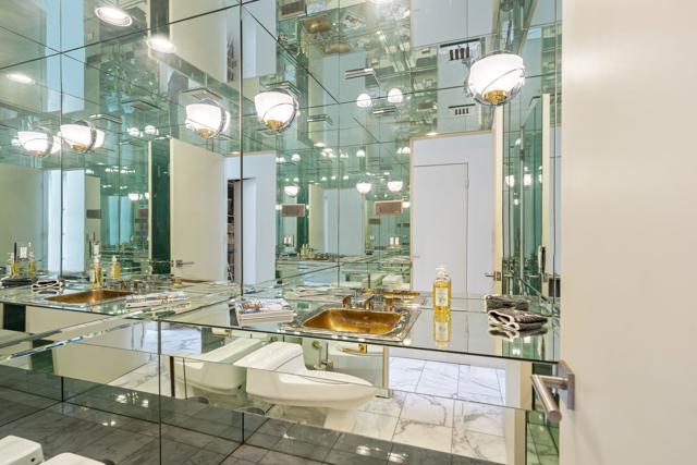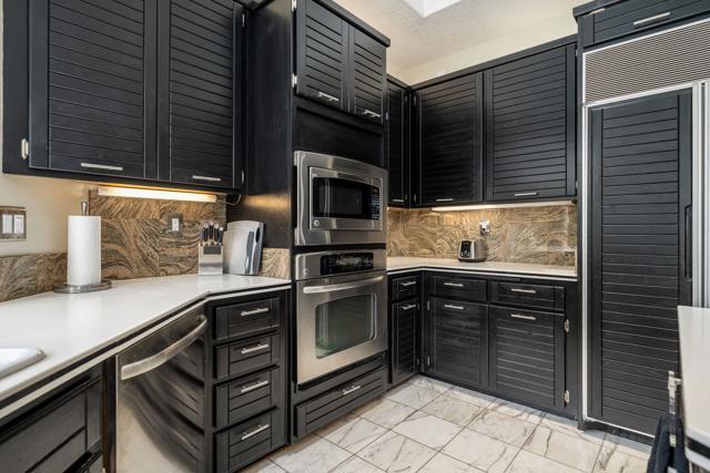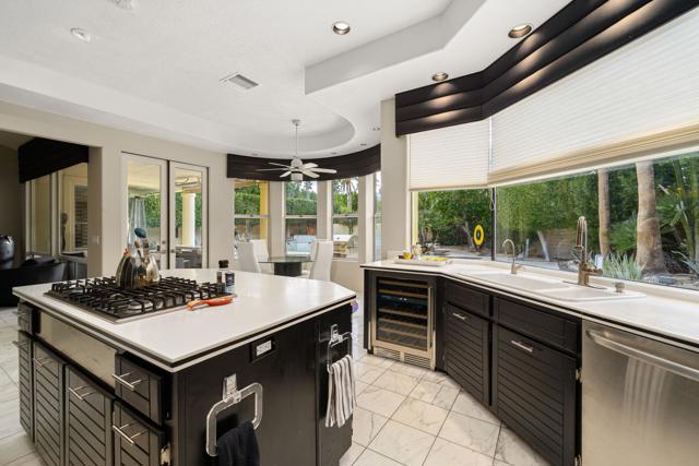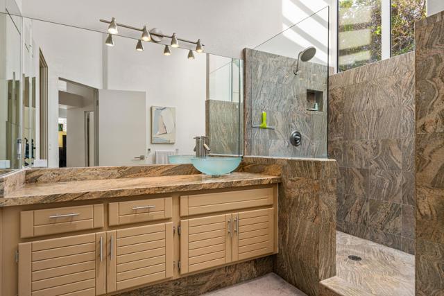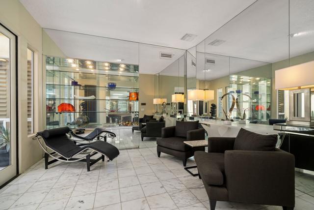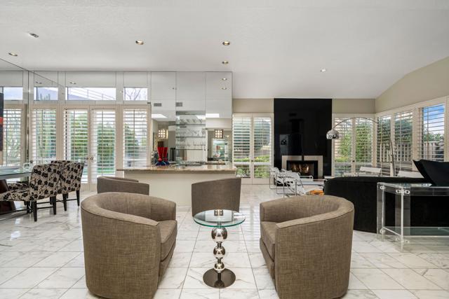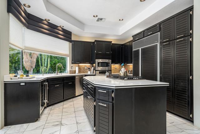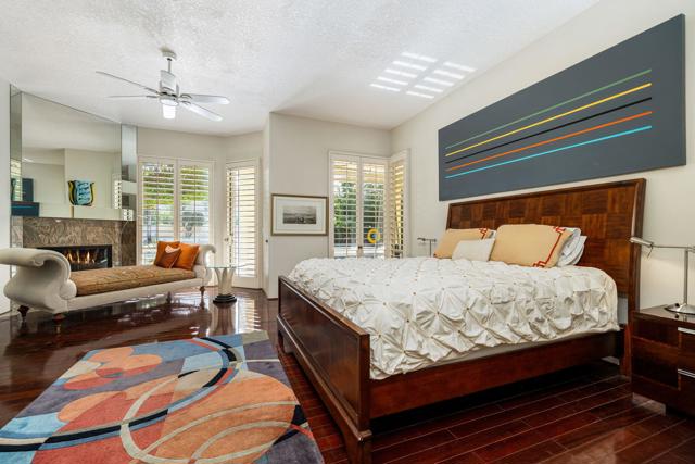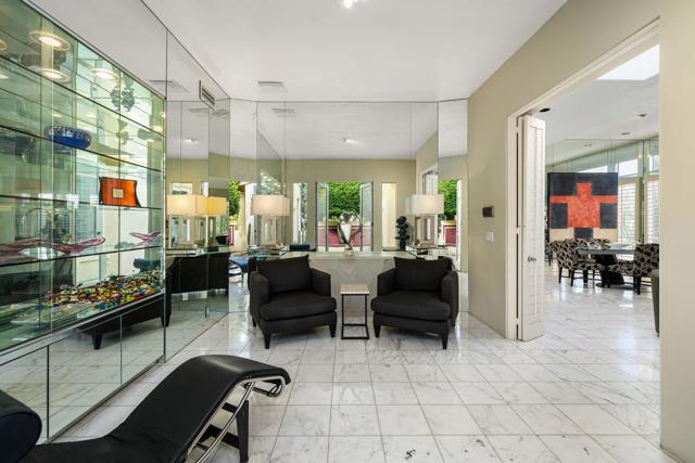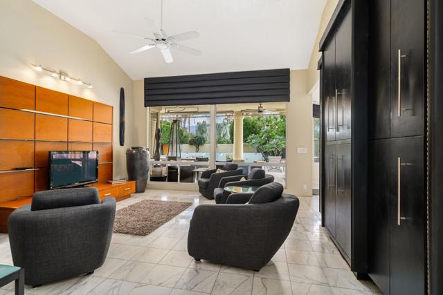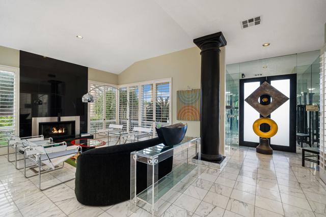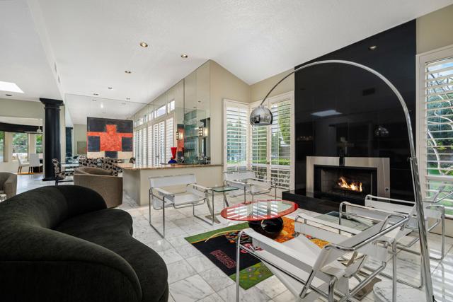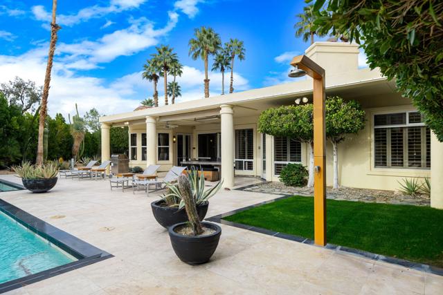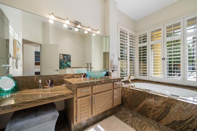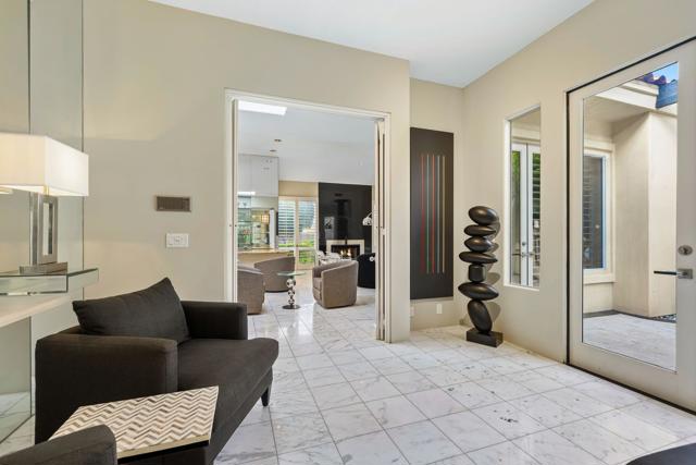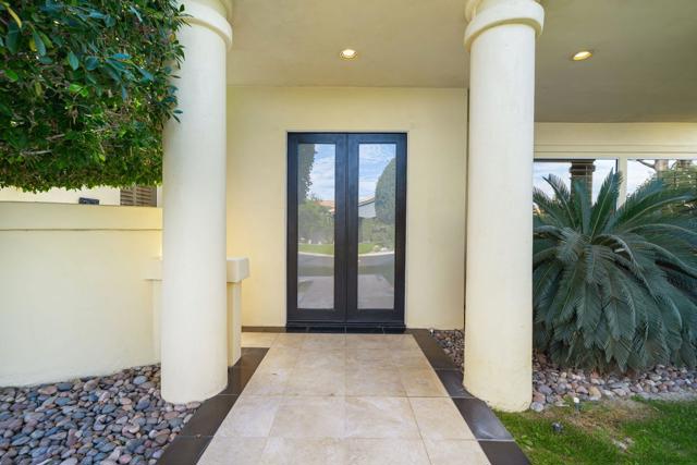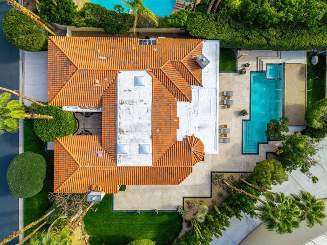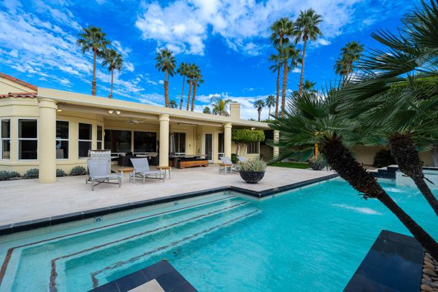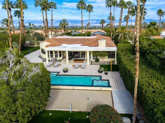 Fantastic and RARE opportunity to own one of the largest lots inside guard-gated Monterra, a high-end enclave of approx. 95 homes. This former model home for the community is sited on an extremely private, corner lot nearly 1/2 acre in size. Prime South Palm Desert real estate! The largest and most coveted floor plan in Monterra, this super spacious home is offered turn-key furnished and its layout is one of the most versatile you'll find anywhere. A private, quiet courtyard with burbling fountain leads directly into a charming entry foyer and then into the open living space that defines Monterra living. Cozy living room with raised hearth gas fireplace and adjacent wet bar provide intimate conversation areas. All three bedrooms are well-separated and are ensuite with their own private baths. The primary bedroom is oversized with its own gas fireplace and TWO full separate bathrooms as well as TWO separate walk-in closets. There is a separate family room off the kitchen and a nearby hall half-bath. Many oversized windows and double-doors surround the house and inside several large skylights and a solar tube bring all the light in for true desert ambiance. Outside is truly magical. Sparkling pool is large and refreshing with spa, waterfalls and surrounded with square marble tile decking. Plenty of room to entertain lavishly year round under the large covered patio - even has space heaters installed above for winter nights. Explore your own entire arborium of magnificent ficus trees, olive trees, swaying palms, shrubs - and many citrus specimens: orange, lemon, meyer lemon, grapefruit, more. Relax playing a round of petanque on your own private lighted court. The side yard features an enormous marble clad pavilion, with more trees, desertscape - and more than enough room for your own private sculpture garden or putting green. A truly remarkable find! Lavishly entertain 300 people with ease in this large home and surrounding property. Large 3-car garage & zoned HVAC. Monterra is a golf-cart ride away from some of the top golfing venues in the desert and is literally adjacent to famed Ironwood CC for those who want club access without high HOAs. Just minutes to world-class dining, shopping, galleries, and services on Palm Desert's famed El Paseo. Nearby are the McCallum Theater and College of the Desert. Walk to the Living Desert! 25 minutes to PS Int'l. Monterra's LOW HOAs cover the guard gate and all common areas.