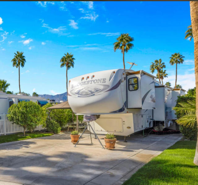 This delightful resort property truly presents a fantastic opportunity. It's perfectly situated on a charming, quiet street, offering a tucked-away feel that's both private and peaceful. Walking distance to La Palma Clubhouse, placing all its amenities and social activities just moments away. Close proximity to the resort's main entrance ensures exceptionally smooth and convenient access for all your comings and goings. One side of the lot features a white fencing providing a lovely backdrop and potential for climbing vines. The mature landscaping is beautifully contained within sturdy brick planters, offering a wonderful selection of trees including an olive tree, alongside three citrus trees - a grapefruit, an orange, and a lime . Adding a splash of color and delightful fragrance, three flowering trees complete this property. This outdoor space comes fully equipped for relaxation and entertaining. An aluminum gazebo is already in place, offering both fabric shades for sun protection and integrated screens for comfortable, bug-free enjoyment throughout the day and evening. Adjacent to this inviting space, a dining table with four chairs awaits al fresco meals and gatherings. A high-quality 4-burner gas grill is included, perfect for preparing delicious outdoor meals. To help maintain a tidy and organized space, two convenient storage boxes are provided, ideal for cushions or outdoor essentials. Lastly, three charming terracotta flower pots are ready for your personal touch, whether with vibrant seasonal blooms or fragrant herbs.