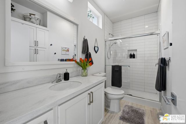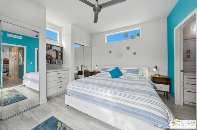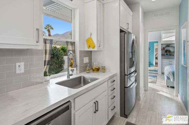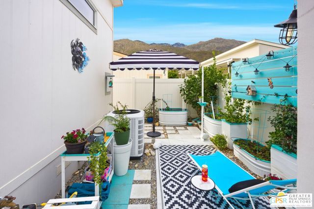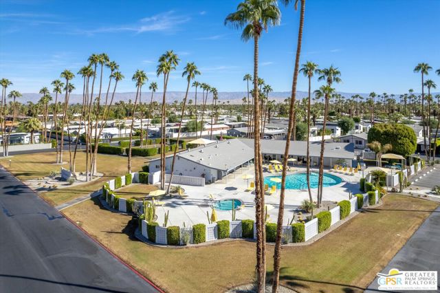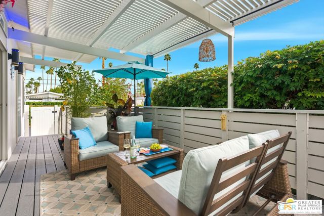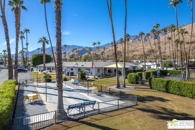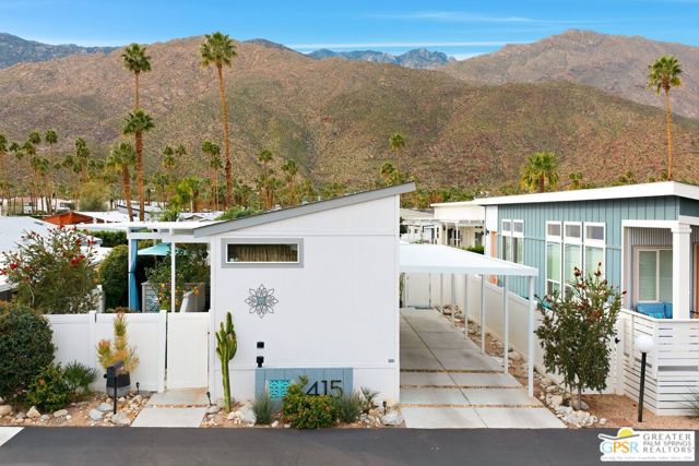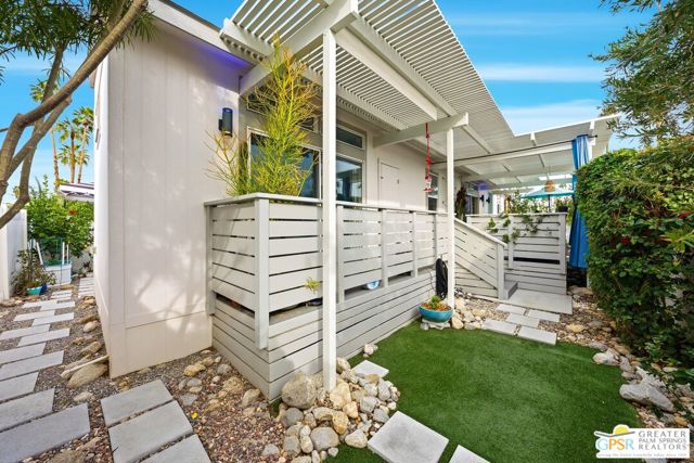 Located on a quiet street within the iconic Palm Springs Mobile Club, this thoughtfully landscaped home offers privacy without compromising spectacular mountain views. Leaning into the sought after mid-century modern design, the home delivers bright, efficient, low-maintenance desert living. Highlights include soaring 9-foot ceilings and clerestory windows that flood the space with natural light. The well-appointed galley kitchen is both stylish and functional. The primary suite features mirrored closets, an ensuite bath with a walk-in shower, and direct access to the outdoors. An expansive extended deck invites seamless indoor-outdoor living ideal for hosting or just relaxing under the desert sky. The fully enclosed yard is thoughtfully designed with outdoor curtains for year-round sun control and raised garden containers for effortless desert gardening, a perfect space for both entertaining and pampered pets. Offered turn-key furnished, this home is move-in ready. Palm Springs Mobile Club is a vibrant and welcoming community rich in amenities, including two dog parks, a pool and spa, fitness center, a clubhouse with dance hall and game room, billiards, shuffleboard, BBQ area, and fire pit, all embracing an exceptional Palm Springs lifestyle.
