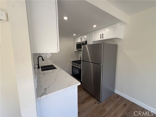 Bright and refreshing Vista Del Oro studio apartment remodeled throughout, featuring a newly updated kitchen with white shaker cabinetry, quartz countertops, and a classic subway tile backsplash. Vinyl flooring runs throughout the open, light-filled layout, creating a clean and modern feel. Includes all appliances, one covered parking space, and access to community laundry. Move-in ready and ideally located in a desirable neighborhood. Tenant pays gas and electric. This unit is on the second floor (no elevator).
