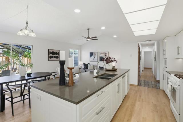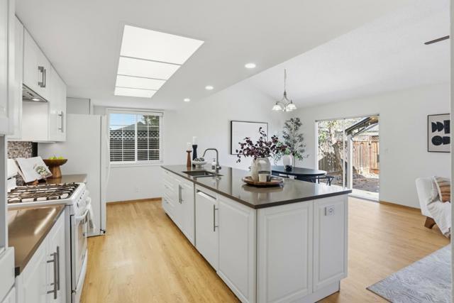 Welcome to this thoughtfully updated single-family home in the desirable Thousand Oaks neighborhood of Blossom Valley. Offering 3 bedrooms and 2 bathrooms across 1,453 square feet, this residence blends timeless design with modern comfort. Refinished hardwood floors, fresh interior paint, abundant natural light, and new recessed lighting create a bright, welcoming atmosphere. The remodeled kitchen features white shaker cabinetry, quartz countertops, and a large island, opening seamlessly to the family room for effortless everyday living and entertaining. Vaulted ceilings in the living room, family room, and primary bedroom add volume and architectural interest. The hallway and primary bathrooms were remodeled within the last two years, and dual-pane windows enhance comfort throughout. The recently re-landscaped backyard is ideal for indoor/outdoor living, featuring a covered gazebo, lawn area, and a large shed offering flexible use. Conveniently located near parks, shopping, and freeway access, this home offers comfort, functionality, and a strong sense of community.