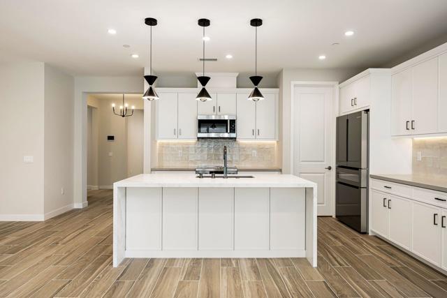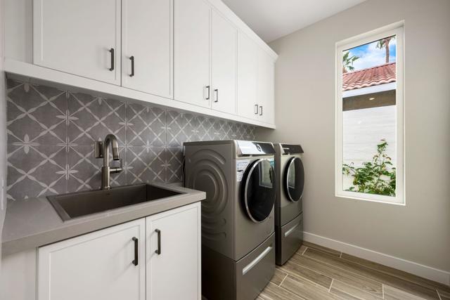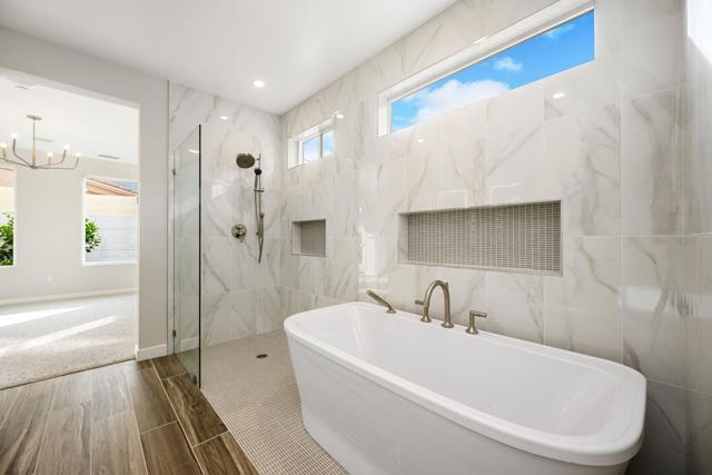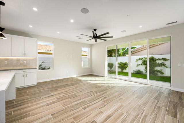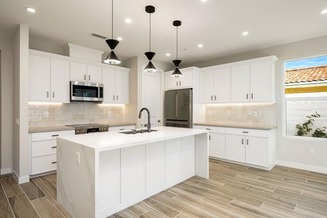 Set within La Quinta Cove, this newly constructed modern residence by award-winning GHA Companies offers a refined yet livable approach to desert architecture. The design is clean and contemporary, shaped by light, proportion, and an easy sense of flow that feels natural rather than forced. From the entry, the home opens into a bright, expansive great room where living, dining, and kitchen spaces connect as one continuous environment. Tall ceilings and an open layout with integrated speakers throughout create a sense of volume and calm, allowing the home to breathe. The kitchen anchors the space with quartz countertops, a generous modern island, Bosch appliances, walk-in pantry, and curated finishes that feel intentional without being overdesigned. Large sliding glass doors extend the interior to a covered patio and a low-maintenance, drought-conscious landscape, creating a natural transition between indoor and outdoor living. The home is designed to move easily with the rhythm of the desert, open in the morning, relaxed in the evening, and effortless in between. The primary suite is positioned as a quiet retreat with direct patio access and a spa-style bath featuring dual vanities, clerestory windows, a walk-in shower, separate soaking tub, and a custom walk-in closet. Two junior ensuites, each with their own private bath, offer flexible space for guests, family, or work-from-home use, along with a separate guest bath. Additional features include owned and paid-for solar, keyless entry, integrated security system, a dedicated laundry room with utility sink, attached two-car garage, west-facing facade, and no monthly HOA fees. Located just minutes from Old Town La Quinta and moments from world-class dining, golf, shopping, resorts, and entertainment, this home offers a modern desert lifestyle defined by design, comfort, and long-term livability.