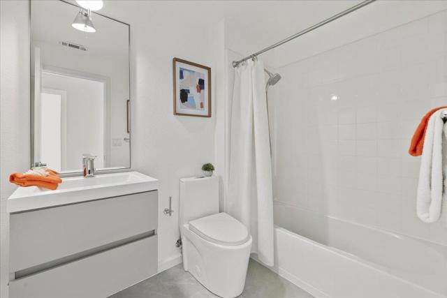 Top-Floor Corner Retreat - A Rare Find! This beautifully updated, light-filled home is ~100 sq ft larger than most 2-bedrooms here and showcases a rare KITCHEN ISLAND a true standout seldom found in this community paired with UPGRADED APPLIANCES and sleek contemporary finishes throughout. The sun-drenched living space is elevated by a designer statement Nelson Saucer Bubble Pendant, while both bathrooms shine with stylish modern upgrades, including an elegant Artemide Tolomeo Wall Lamp. This corner unit SHARES ONLY ONE WALL with a neighbor and EXCEPTIONALLY PRIVATE, features SOARING CATHEDRAL CEILINGS, PATIO and an airy open-concept layout that feels both expansive and serene. The inviting primary suite features a WALK-IN CLOSET, DOUBLE SINKS, and an OVERSIZED SOAKING TUB. Set within a charming BOUTIQUE COMMUNITY of ONLY 34 RESIDENCES, this home offers a rare blend of style, space, and exclusivity. Enjoy a prime walkable location near SEVEN SEAS PARK, VTA, and GROCERY OUTLET, with EASY ACCESS to Hwy 101 & 237 and major tech employers. Complete with 1-CAR ATTACHED GARAGE, DESIGNATED PARKING, STORAGE CLOSET, GUEST PARKING, and AMPLE STREET PARKING. Don't miss this rare opportunity to own a home that truly delivers style, light, privacy and location in one exceptional package.
