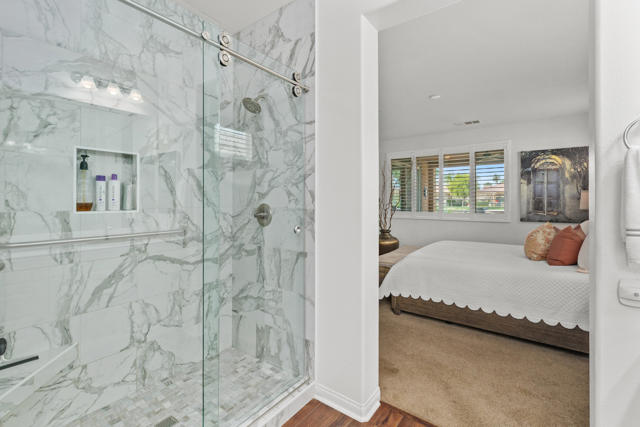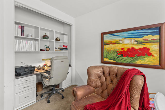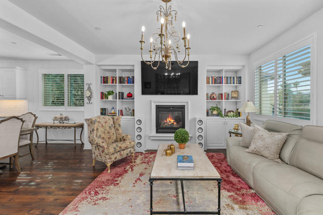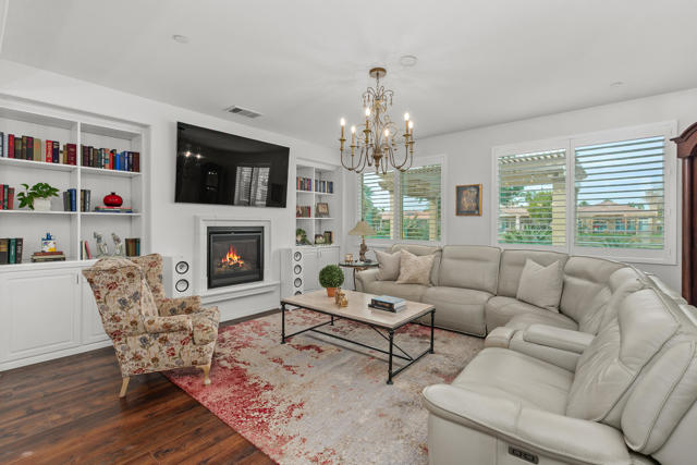 Welcome to this beautifully upgraded 3-bed, 3-bath home offering 1,995 sq. ft. of modern comfort and timeless elegance. Built in 2019 and thoughtfully designed throughout, this residence captures the essence of effortless desert living. Step inside and instantly feel at home with wood-look vinyl floors, tall ceilings, and an inviting open floor plan. The living room exudes warmth with a cozy fireplace and custom-built-in cabinets and bookshelves, creating the perfect setting for relaxing evenings or lively gatherings. The spacious kitchen is the heart of the home, featuring a large island, granite countertops, white cabinetry, subway-tile backsplash, stainless steel appliances, and double-pane windows and sliders that fill the space with natural light. A dedicated laundry room with cabinets and a folding counter, plus a convenient powder room, adds ease and functionality to everyday living. Thoughtful separation of space offers privacy for guests with a guest bedroom complete with an en-suite bath, while the primary suite feels like a private sanctuary highlighted by a tile walk-in shower, quartz countertops, dual vanities, and a large walk-in closet with custom built-ins. Step outside to an entertainer's paradise. The backyard features paver walkways, a deluxe built-in barbecue and dining area, a gas fireplace, an elegant Aluma-wood pergola, and an above-ground spa, all set against sweeping golf course and mountain views. Mature citrus trees along the side of the home add charm, fragrance, and that perfect desert touch. Additional highlights include shutters throughout, an instant water heater, and a large two-car garage plus a golf cart garage for added convenience. Located in the desirable Indian Palms Country Club, this home offers resort-style living in a beautifully maintained community. With modern upgrades, inviting spaces, and unforgettable views, this is the desert home you've been waiting for.