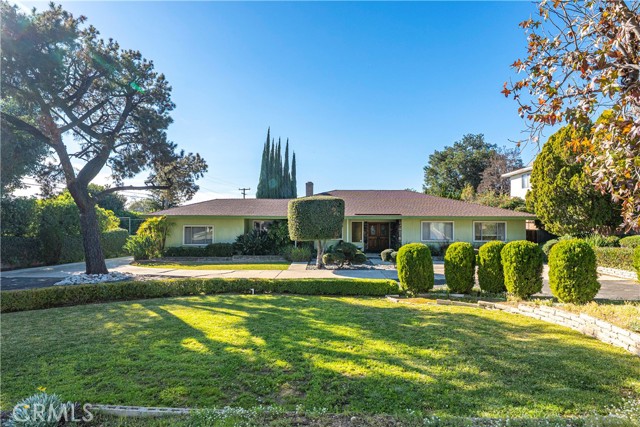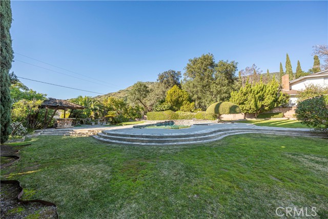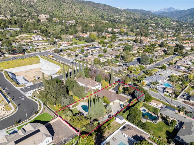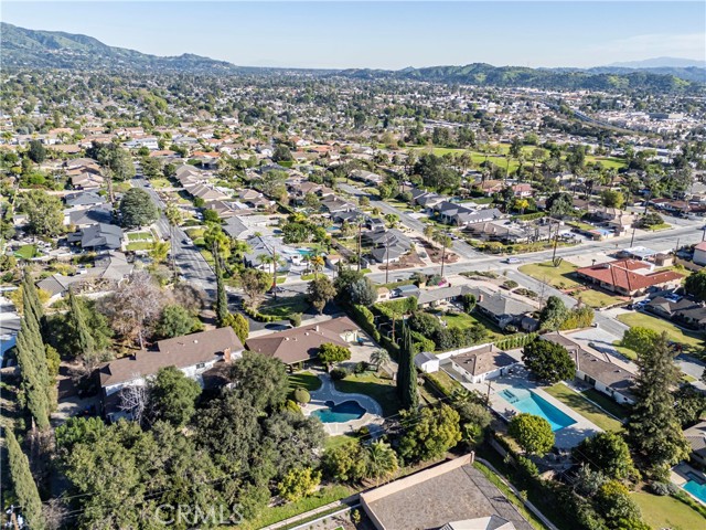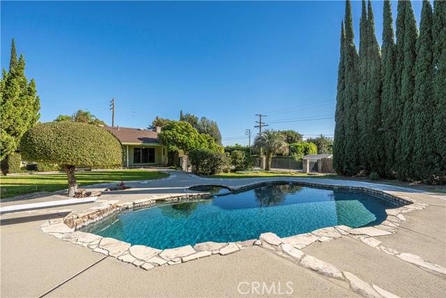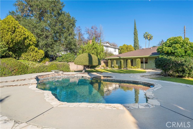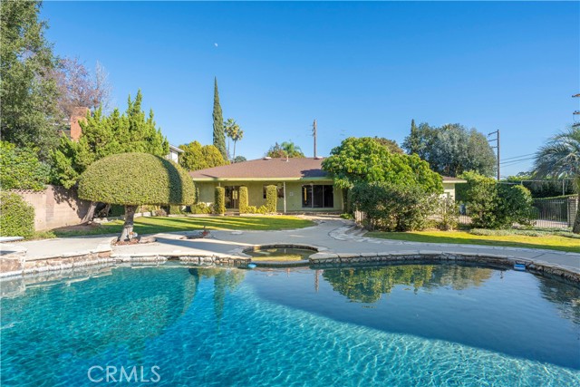 This single-story residence is situated on an expansive lot in a Glendora neighborhood near the foothills and offers a functional floor plan with generous indoor and outdoor living spaces. The home features approximately 2,160 square feet of living space with four bedrooms and three bathrooms, including a primary suite with a three-quarter bathroom and dual-sink vanity. A spacious living room with fireplace provides a comfortable gathering area, while the adjacent dining and family areas connect seamlessly to the kitchen. The kitchen includes ample cabinetry, counter space, and a breakfast nook, with direct access to the backyard. Additional interior features include central air conditioning, multiple sliding doors and windows for natural light, and an attached two-car garage with a long driveway providing additional parking. The backyard is designed for both everyday use and entertaining, highlighted by a pool and spa surrounded by curved concrete decking and natural stone accents. Multiple patio areas, a covered patio, lawn space, mature landscaping, and winding walkways create a private, park-like setting. A gazebo-style structure and expansive yard offer flexibility for outdoor dining, recreation, and gatherings.
