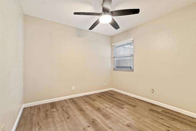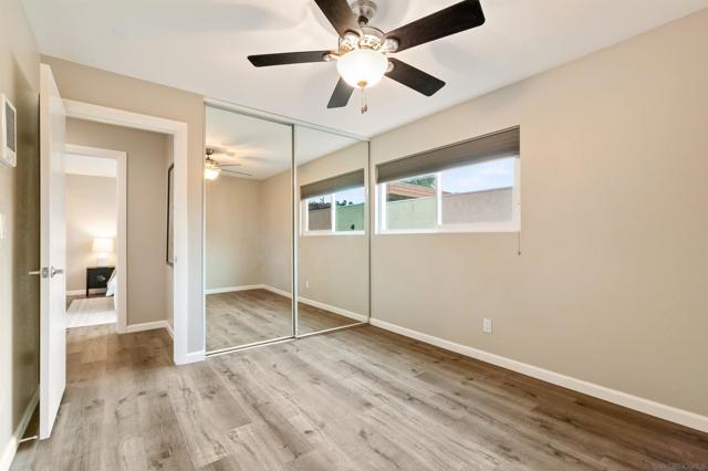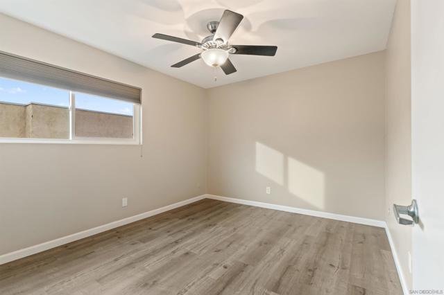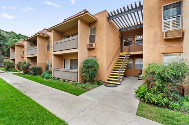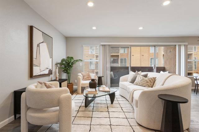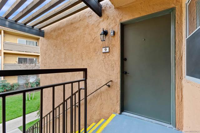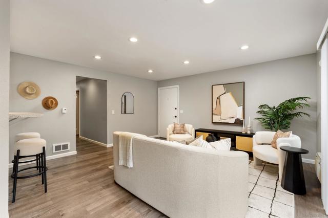 Located in the highly sought-after SDSU College area, this updated upstairs 3-bedroom, 2-bath unit offers the perfect setting, tucked along a tree-lined walkway with lush landscaping and a sparkling community pool. Step inside to discover a light-filled interior with LVP flooring throughout, dual-pane windows, designer paint, LED recessed lighting, and multiple ceiling fans. The kitchen is a showstopper, featuring stunning quartz countertops, custom cabinetry with bar seating, pendant lighting, and stainless steel appliances. Every detail has been thoughtfully upgraded, including both remodeled bathrooms with stylish finishes and modern hardware. Additional highlights include a side-by-side washer and dryer, electric heaters, air conditioning, and a covered balcony off the living area. This larger, most desired floor plan includes two covered parking spaces, while the unbeatable location puts you close to the trolley line, popular dining spots, Lake Murray, and offers seamless freeway access. VA Approved!