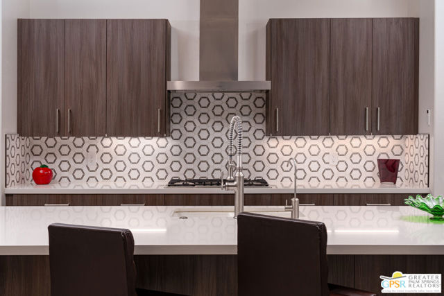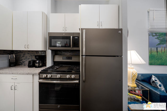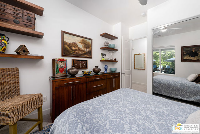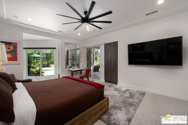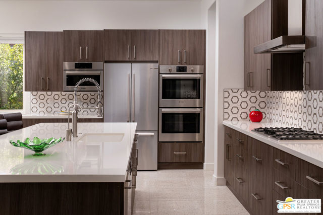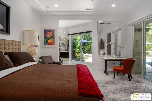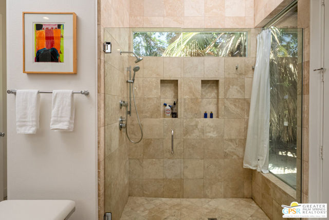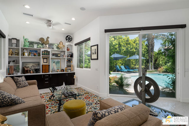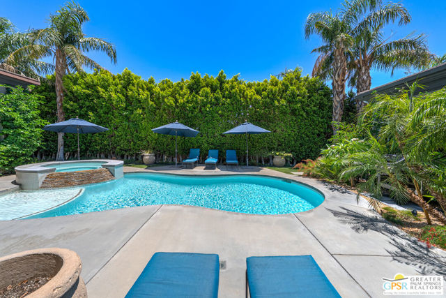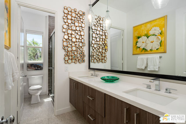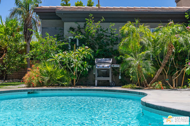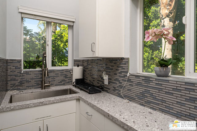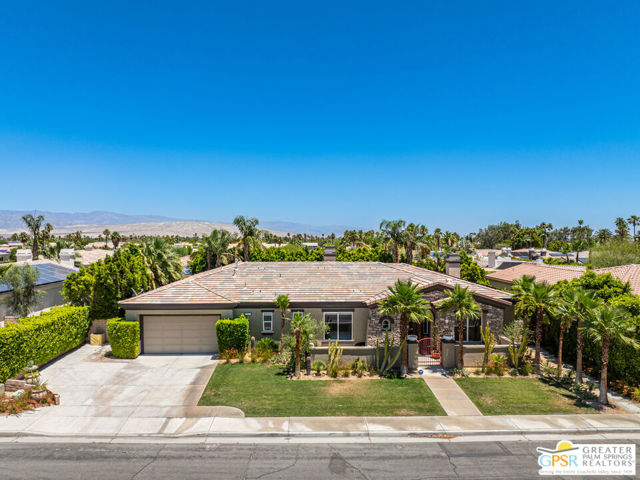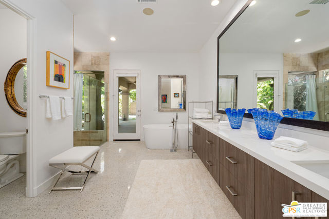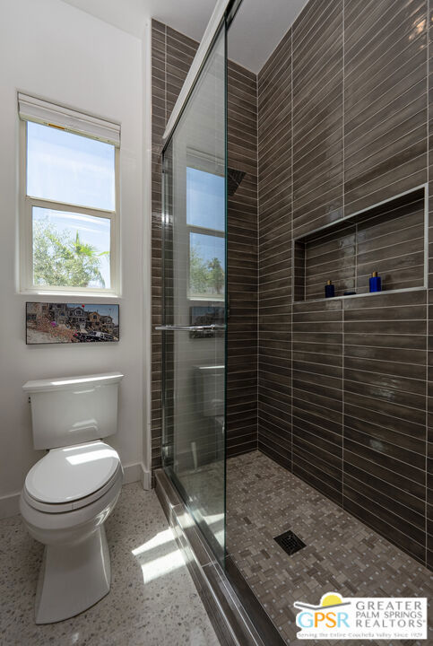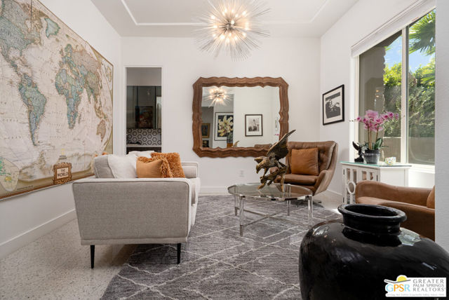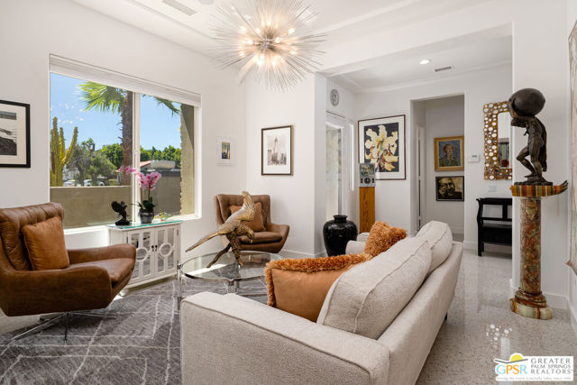 Enormous beautifully renovated 3 bedroom home with separate 1 bed/1 bath GUEST HOUSE in Palm Springs. The Guest House features a separate private walkway, gate and entrance as well as a full kitchen and washer/dryer. Built in 2004, this home has been lovingly maintained and upgraded. The large terrazzo tile flooring extends throughout the entire home. The spacious open floor plan brings the kitchen, living room and dining room together for inclusion for all. This home is spacious and boasts an open kitchen that flows into the great room, which is anchored by a fireplace and tempting views of the private pool/spa area. The large gourmet cook's kitchen includes an large central island with counter seating, Butler's pantry/coffee station, dry goods pantry, Bosch appliances, gas cooktop and modern tile backsplash. The primary suite is EXPANSIVE with a full office/private living room/media room attached at the back. With a small change, this room could even be a 5th bedroom or 2nd casita as it has it's own private entrance. The primary bath includes a stand alone tub, large shower, dual sink floating vanity, appropriately sized expansive mirror, separate water closet and walk-in closet with custom shelving. Two guest suites share the guest bath also with stunning dual sink vanity and matching impressive custom mirror. Views of the pool and spa can be seen from almost every room through dual pane windows and sliding doors. Energy efficiency was well considered with multiple AC zones, enhanced ceiling fans and 42 solar panels. Parking includes an oversized 2-car garage and a driveway with room for 3 cars. Other amenities include water conditioner system, outdoor shower, tankless water heater and a separate laundry room with upper and lower cabinets, sink, counter space and window with a mountain view. THE CASITA has a separate PRIVATE walkway and entrance. Inside, a bedroom, living room, stackable laundry, desk/dining table, kitchen with cabinets, counters, refrigerator, sink and disposal, gas range, oven and microwave. The owners have rented this casita out casually making about $20,000 per year income. Alternatively, live and use the casita while renting out the main house for even greater income. In the back yard, the pool and spa with waterfall takes the main focus. Don't miss the hardline gas grill, outdoor shower, pet friendly grass areas and entertainment area for outdoor table tennis and games. The versatility of the homes features will make you feel at home immediately upon arrival. On land that you own. No HOA. Solar system includes 42 panels w 13.73kW.