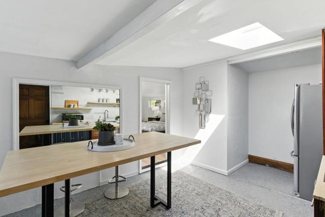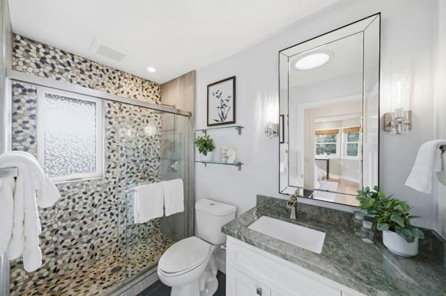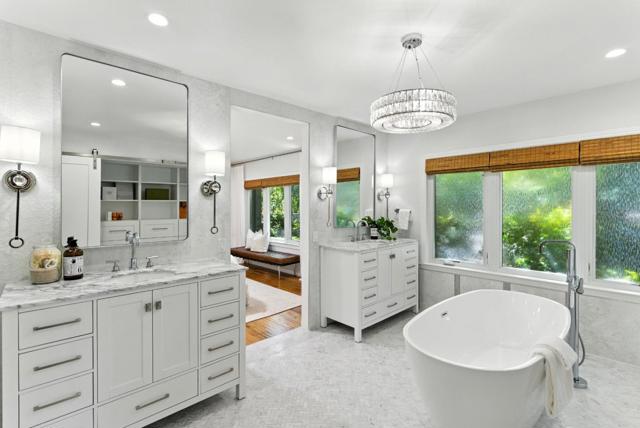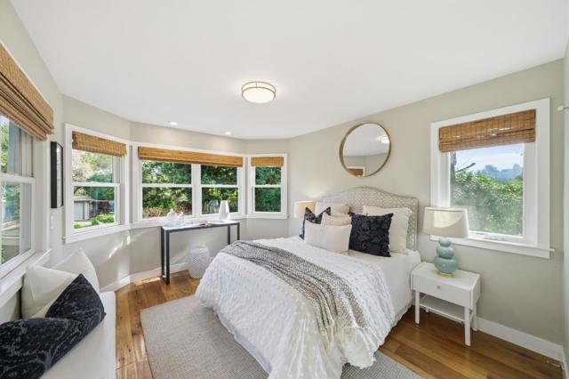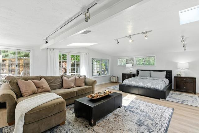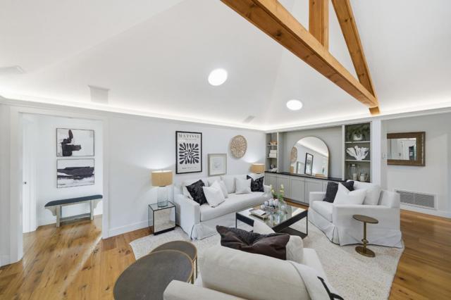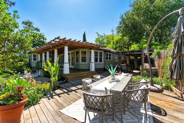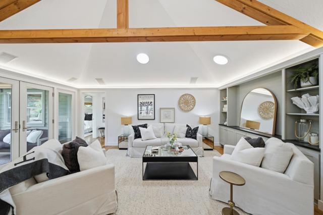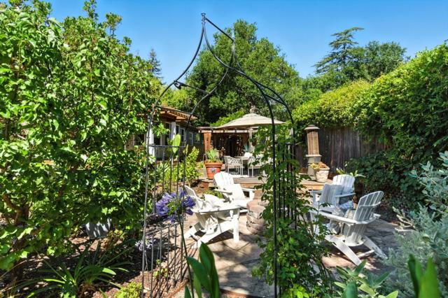 Hidden gem on nearly half an acre behind a private gated entry with professionally landscaped grounds, mature orchard trees, & year-round blooms. The exceptional single-level 3 bedroom, 3 bath 1,842 sqft main residence was completely renovated in 2017 & features an open, light-filled floor plan with skylights & French Oak floors throughout. The entry opens to a spacious living room with custom built-ins & designer lighting, flowing seamlessly into the chef's kitchen with a large center island, Thermador appliances, & dining area. Multiple glass doors open to a stunning 400+/-sq ft lanai, creating effortless indoor/outdoor living. The primary suite retreat with spa-like bath featuring Italian porcelain tile, mosaic marble floors, chandelier, & custom closet. Outdoor living spaces include multiple seating areas, an outdoor kitchen, & gas fire pit, ideal for entertaining year-round. A detached garage offers approx. 687 sqft of flexible space for guest suite or home office, plus an additional 600+/- sqft basement. Additional features include a private well & potential to add an ADU or expand further. Ideally located moments from Village shops & restaurants, hiking & biking trails, Edgewood Park, Stanford University, major tech campuses, & Interstate 280. Excellent Woodside schools.