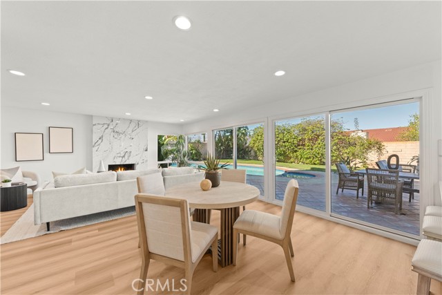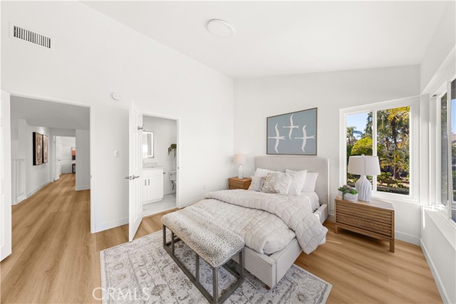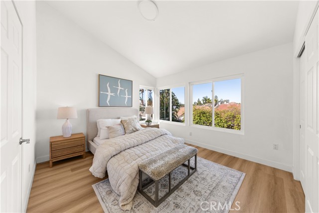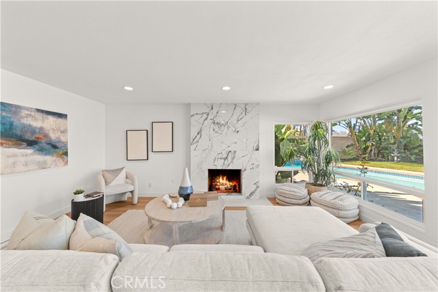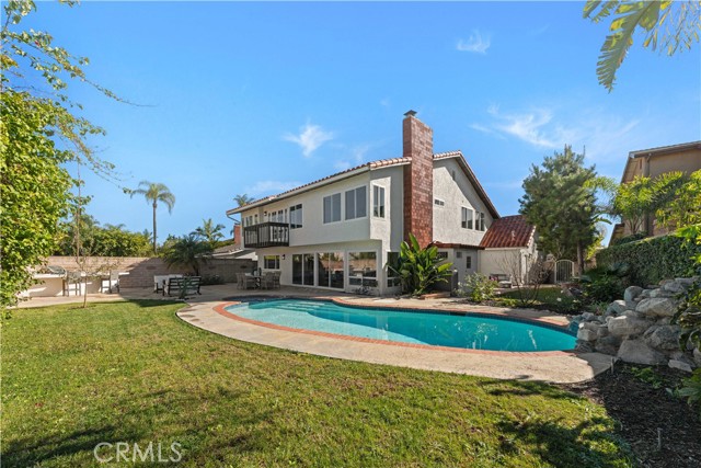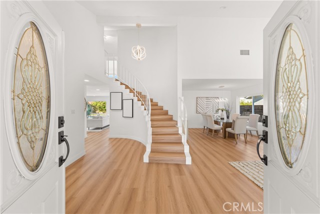 Welcome to this artistically remodeled pool home, ideally located in a mature and tranquil neighborhood of Laguna Hills. With no HOA, low property taxes, and access to the highly acclaimed Saddleback Valley School District, this home delivers the perfect blend of comfort, convenience, and value. Boasting stunning curb appeal, the exterior features flowing water fountains, a welcoming front yard sitting area, tree-lined side yard, a private driveway, and a 3-car garage. Inside, fine craftsmanship shines through every inch of this thoughtfully renovated residence. Step into a bright, open interior with soaring ceilings, newly remodeled stairways, and a seamless blend of modern design and warmth. The living room opens through brand-new French doors to the front porch, offering serene views of lush landscaping and the gentle sounds of the fountain. The formal dining room is highlighted by luxury wood-textured flooring, large sliding windows, and elegant pendant lighting. The gourmet kitchen is a chef’s dream, featuring new stainless-steel appliances, white shaker cabinets with solid wood drawers, marble-style quartz countertops and backsplash, and sleek new hardware. Enjoy effortless indoor-outdoor living as the breakfast area and family room flow directly to the backyard retreat. Perfect for multi-generational living, a guest bedroom with full bathroom is conveniently located on the main level. Upstairs, discover four additional bedrooms and three updated bathrooms, including two en-suites. The primary suite impresses with vaulted ceilings, double-pane French doors, and a private balcony offering sweeping views. The primary bath features dual vanities, a walk-in shower, and a sunlit soaking tub room for the ultimate in relaxation. Additional bathrooms are outfitted with new quartz vanities, modern walk-in showers with barn door closures, and updated lighting and ventilation. Step outside to your own private oasis—a sparkling oversized pool and spa, built-in BBQ island with fridge, generous patio space, and mature trees create the perfect backdrop for entertaining or quiet retreat. The spacious side yard includes raised garden beds, natural turf, and a peaceful reading nook. Just a short walk to community parks, Laguna Hills Plaza, Target, and only one minute from the I-5 freeway, you’ll enjoy unmatched accessibility while still relishing peaceful residential living.