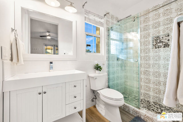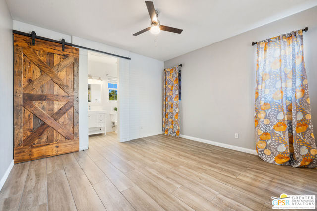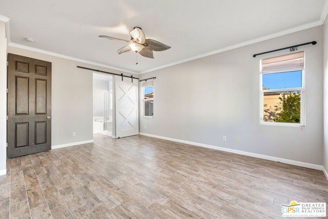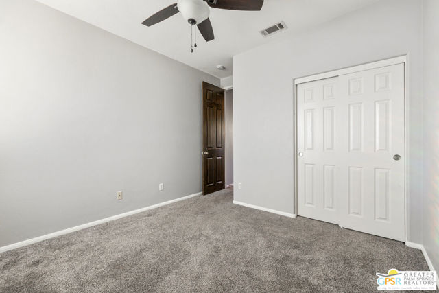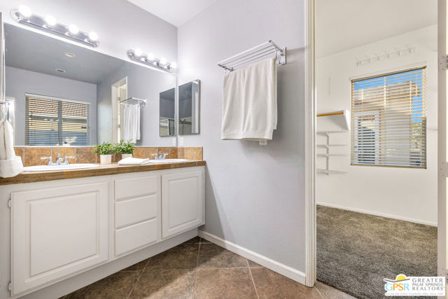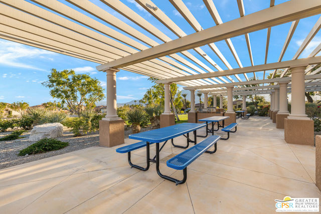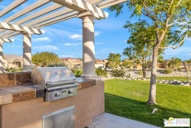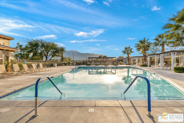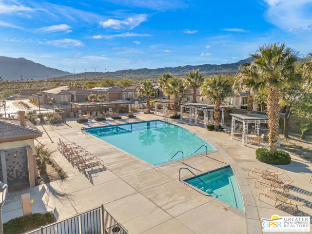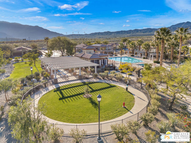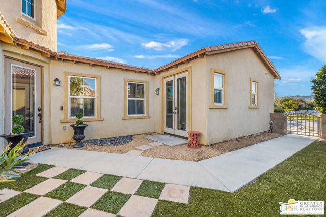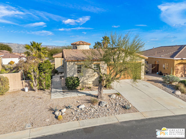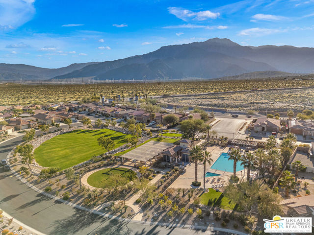 Set on a quiet cul-de-sac and one of the largest lots in Skyborne, this 3-bedroom, 3-bath home offers 1,786 sq ft of flexible living space designed to adapt to many lifestyles. A private in-law suite with its own entrance works just as well for guests, extended family, a home office, creative studio, or workout space. Built in 2006 and situated on fee land with no land lease, the home offers long-term value and peace of mind.A fully fenced courtyard creates a welcoming and private entry, while the expansive backyard features mountain views and plenty of room to relax, entertain, or plan future upgrades like a pool. Mature landscaping with drip irrigation keeps outdoor maintenance easy.Inside, the home features granite countertops throughout, tile and vinyl plank flooring in the main living areas, and carpet in one bedroom for added comfort. Two primary suites add flexibility for hosting, shared living, or multi-use layouts, each with barn-door bathroom entrances. The main suite includes a generous walk-in closet.Enjoy direct access to the dog park and greenbelt just outside the front door, with the community pool and spa only a short walk away. Conveniently located just minutes from Palm Springs, this move-in-ready home offers thoughtful design, outdoor potential, and a well-connected neighborhood setting in the Skyborne community.