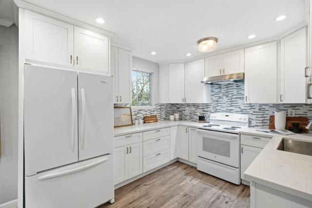 Welcome to your top-floor Campbell retreat at 848 Apricot Avenue #B, a rare corner unit that feels bright, private, and truly move-in ready. Fully remodeled with luxury vinyl plank flooring, recessed lighting, and fresh modern finishes, the spacious layout offers flexible zones for relaxing, dining, and a perfect work-from-home nook. The remodeled kitchen features new soft-close cabinetry, quartz countertops, and a designer tile backsplash, paired with a French-door refrigerator for clean style and everyday function. The generous bedroom includes a walk-in closet and connects to an oversized bathroom with a large vanity and great storage. Natural light pours in, and a sliding glass door opens to the balcony for peaceful treetop neighborhood views. Comfort comes easy with a split-system A/C and efficient floor heating, plus in-unit laundry and abundant storage. Enjoy a private one-car garage, a separate secure storage room with built-in shelving, and a sparkling community pool. Minutes from Downtown Campbell, The Pruneyard, Whole Foods, Campbell Park, and the Los Gatos Creek Trail, with quick access to Highways 17 and 280 and nearby light rail for an easy commute. A move-in-ready home that delivers comfort, flexibility, and the Campbell lifestyle.