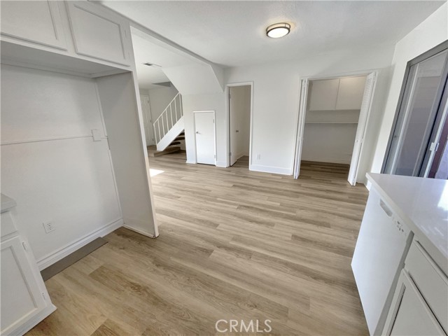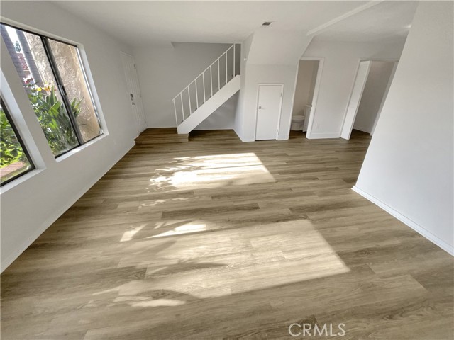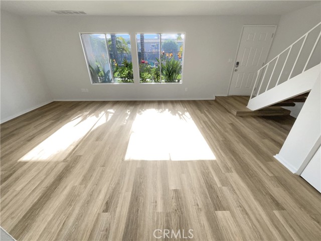 This light and bright condo in the La Veta Monterey community features a freshly updated interior with an open living and dining area, wide-plank wood-style flooring throughout, and large windows that fill the space with natural light. The clean, white kitchen offers ample cabinetry, generous counter space, and a functional layout ideal for everyday living. The bathroom has been refreshed with a white vanity, modern fixtures, and a shower-tub combination. Residents enjoy resort-style amenities including a gated pool and spa area with lounge seating, mature landscaping, and community facilities. Conveniently located near Old Towne Orange, Chapman University, shopping, dining, and major freeways, this home offers comfortable, low-maintenance living in a prime Orange location.