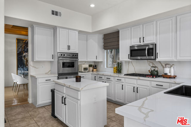 Set behind gates on a quiet private street south of Ventura Boulevard, 18330 Hanan Ct delivers the ideal blend of luxury, privacy, and everyday livability in one of Tarzana's most sought-after enclaves. This striking residence welcomes you with soaring double-story ceilings that open to an impressive formal living room, featuring a fireplace and overlooks lush greenery through grand windows. Designed for both entertaining and daily comfort, the home flows seamlessly into a formal dining room with a recessed ceiling and a generously sized chef's kitchen complete with rich custom cabinetry, quartz countertops, peninsula seating, and an oversized dining area. The adjoining family room offers a warm fireplace, expansive sliding doors, and direct views of the resort-style pool and backyard, perfect for indoor-outdoor living. The main level includes a powder room and a private en-suite bedroom currently used as a home office. Upstairs, the expansive primary suite is a true retreat, featuring a sitting area and a double-sided fireplace shared with a spa-inspired bath boasting a soaking tub, frameless glass shower, dual vanities, and a dedicated makeup area. Three additional bedrooms, each with en-suite baths, plus a laundry room complete the upper level. Offering timeless character with modern comforts throughout, this exceptional home is tucked within a serene gated community just moments from Tarzana's premier shopping, dining, and houses of worship.