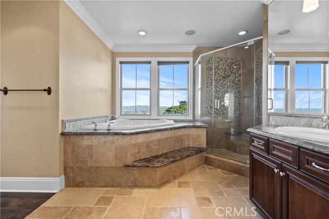 Views, Views, and More Views! Welcome to Cotton Hill Estates, where this custom residence showcases sweeping ocean and coastline panoramas from nearly every vantage point. Perched on a rare, private, and usable 15,000 sq. ft. parcel, this home blends luxury, comfort, and functionality in one exceptional offering. Spanning approximately 3,800 sq. ft., the thoughtful floor plan includes 5 bedrooms plus a dedicated office, 4.5 bathrooms, and a private first-floor suite with its own shower—ideal for guests or multi-generational living. Inside, custom wood and travertine floors set the stage for elegant living. The formal living room impresses with soaring ceilings and recessed lighting, while the spacious dining room flows seamlessly into the gourmet kitchen. A chef’s dream, the kitchen boasts Viking stainless steel appliances—including a 6-burner range with griddle and double oven, warming drawer, dual refrigerator, dishwasher, microwave, hood, and mini-fridge—granite counters, a large center island, and an open connection to the inviting family room. The backyard is a true extension of the home, featuring multiple fruit trees and three distinct areas designed for relaxation, entertaining, and outdoor enjoyment.