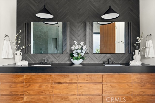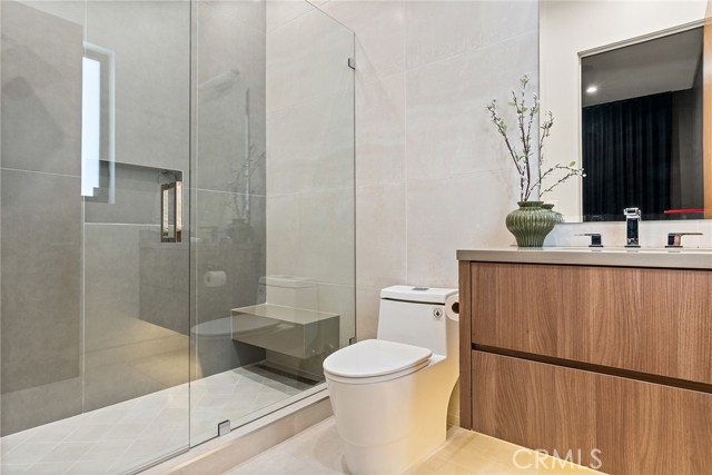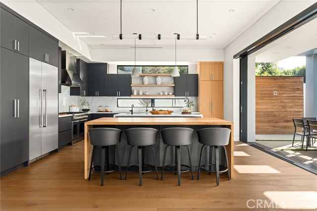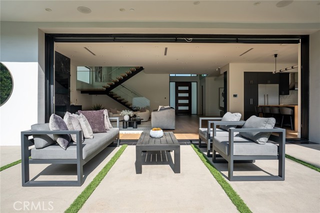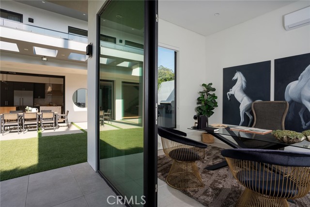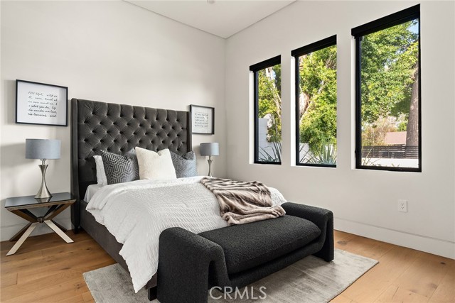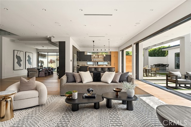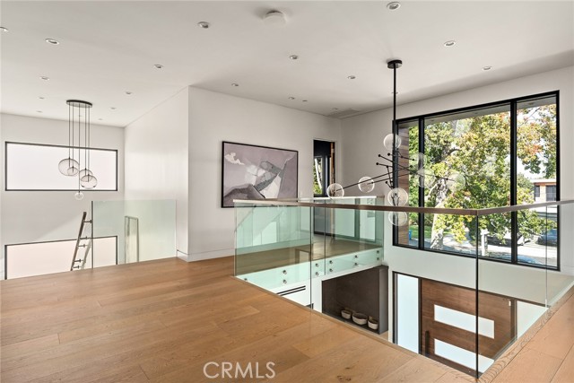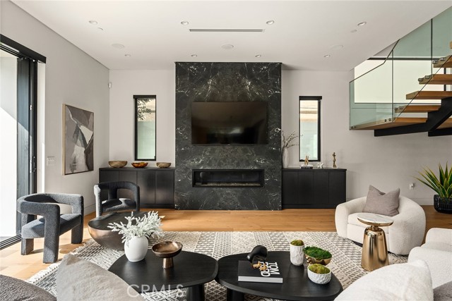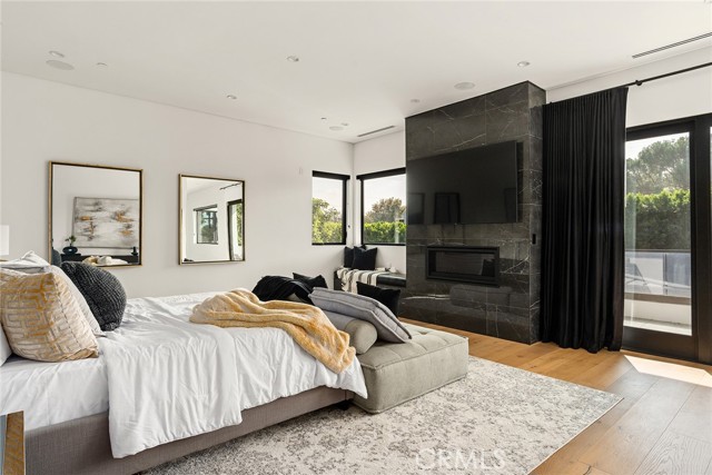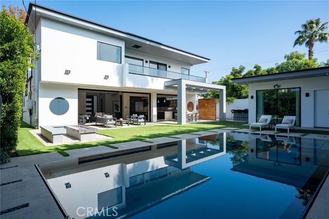A stunning modern residence set on an expansive, flat lot. This 5-bedroom, 6-bath oasis was thoughtfully designed to combine open-concept living with generous space for both entertaining and privacy. Enter through the 10-foot entry door into an open layout featuring wide-plank European oak floors, high ceilings throughout, and a custom floating glass staircase. The main living area flows seamlessly between the formal dining room with built-in buffet, the living room centered around a floor-to-ceiling marble fireplace, and a contemporary kitchen showcasing custom cabinetry, quartz countertops, high-end appliances, and dual islands designed for gourmet cooking and entertaining. The primary suite serves as a private retreat, featuring a marble fireplace, balcony overlooking the yard, spacious walk-in closet, and a spa-inspired bathroom. Full-length glass pocket doors open to a resort-style backyard with a zero-edge pool, spa, fire pit, built-in grill, and a pool house with its own bath—offering the potential for conversion to an ADU, private recording studio, office, or creative workspace. A guest bedroom is conveniently located on the main level, while upstairs features additional bedrooms including a guest suite, a lofted landing with custom built-ins, and a spacious gym that can also serve as an additional bedroom. The upper level also includes a home theater with its own bath, providing flexibility to be used as another bedroom or entertainment space. A well-appointed laundry room adds everyday convenience. Upgrades include electric blinds, a smart home system, custom lighting, security cameras, and more. This exceptional home seamlessly blends luxury, functionality, and style, offering an unparalleled living experience.