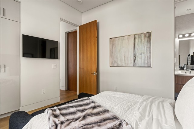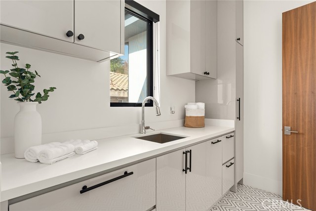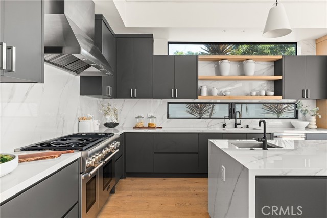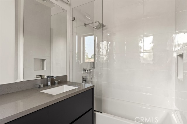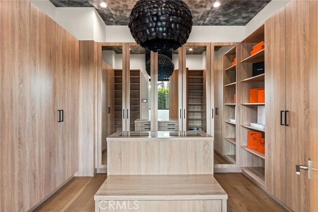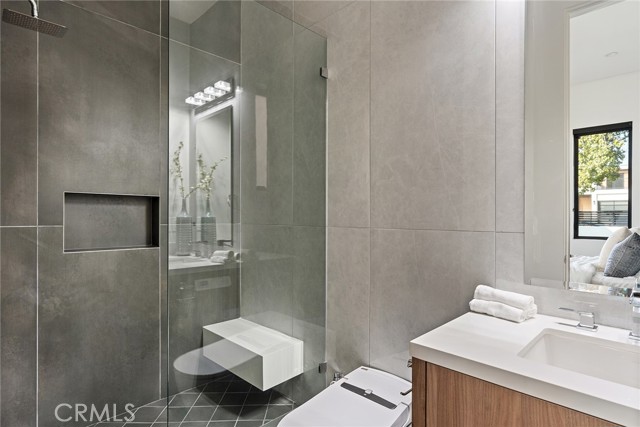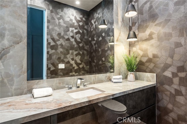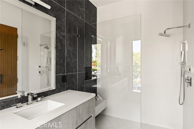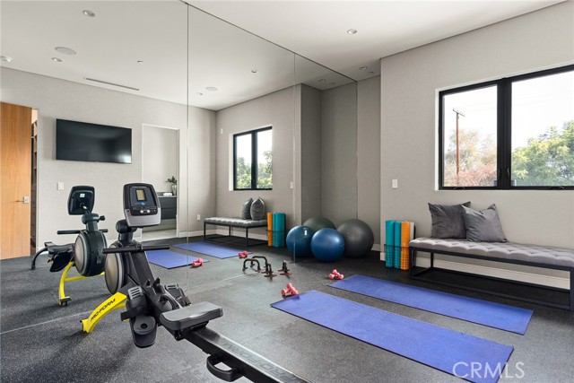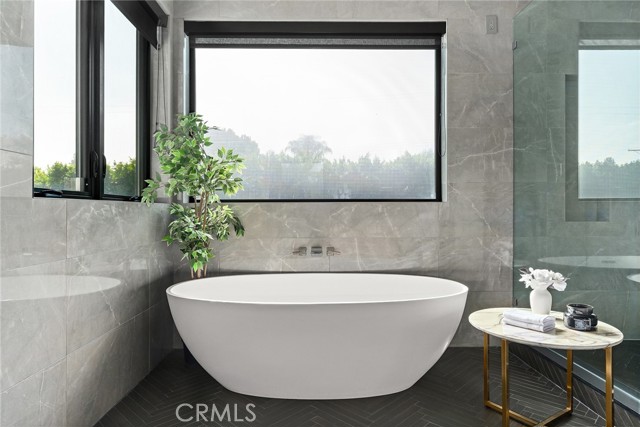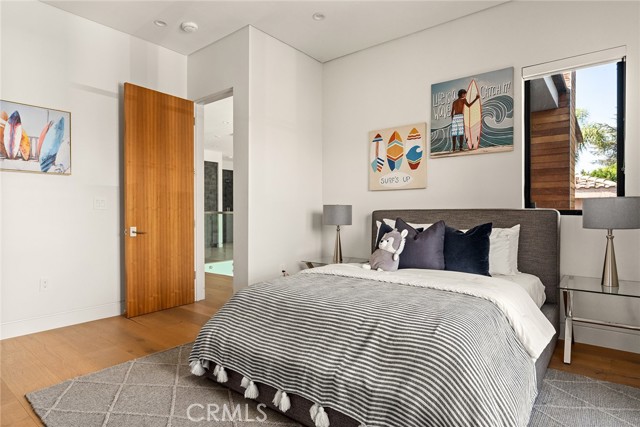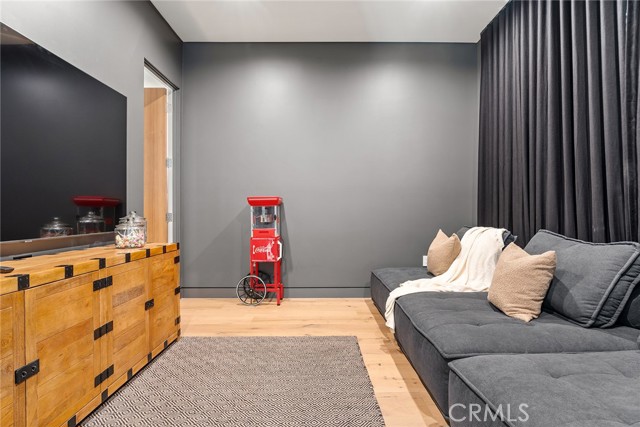 A stunning modern residence set on an expansive, flat lot. This 5-bedroom, 6-bath oasis was thoughtfully designed to combine open-concept living with generous space for both entertaining and privacy. Enter through the 10-foot entry door into an open layout featuring wide-plank European oak floors, high ceilings throughout, and a custom floating glass staircase. The main living area flows seamlessly between the formal dining room with built-in buffet, the living room centered around a floor-to-ceiling marble fireplace, and a contemporary kitchen showcasing custom cabinetry, quartz countertops, high-end appliances, and dual islands designed for gourmet cooking and entertaining. The primary suite serves as a private retreat, featuring a marble fireplace, balcony overlooking the yard, spacious walk-in closet, and a spa-inspired bathroom. Full-length glass pocket doors open to a resort-style backyard with a zero-edge pool, spa, fire pit, built-in grill, and a pool house with its own bath—offering the potential for conversion to an ADU, private recording studio, office, or creative workspace. A guest bedroom is conveniently located on the main level, while upstairs features additional bedrooms including a guest suite, a lofted landing with custom built-ins, and a spacious gym that can also serve as an additional bedroom. The upper level also includes a home theater with its own bath, providing flexibility to be used as another bedroom or entertainment space. A well-appointed laundry room adds everyday convenience. Upgrades include electric blinds, a smart home system, custom lighting, security cameras, and more. This exceptional home seamlessly blends luxury, functionality, and style, offering an unparalleled living experience.